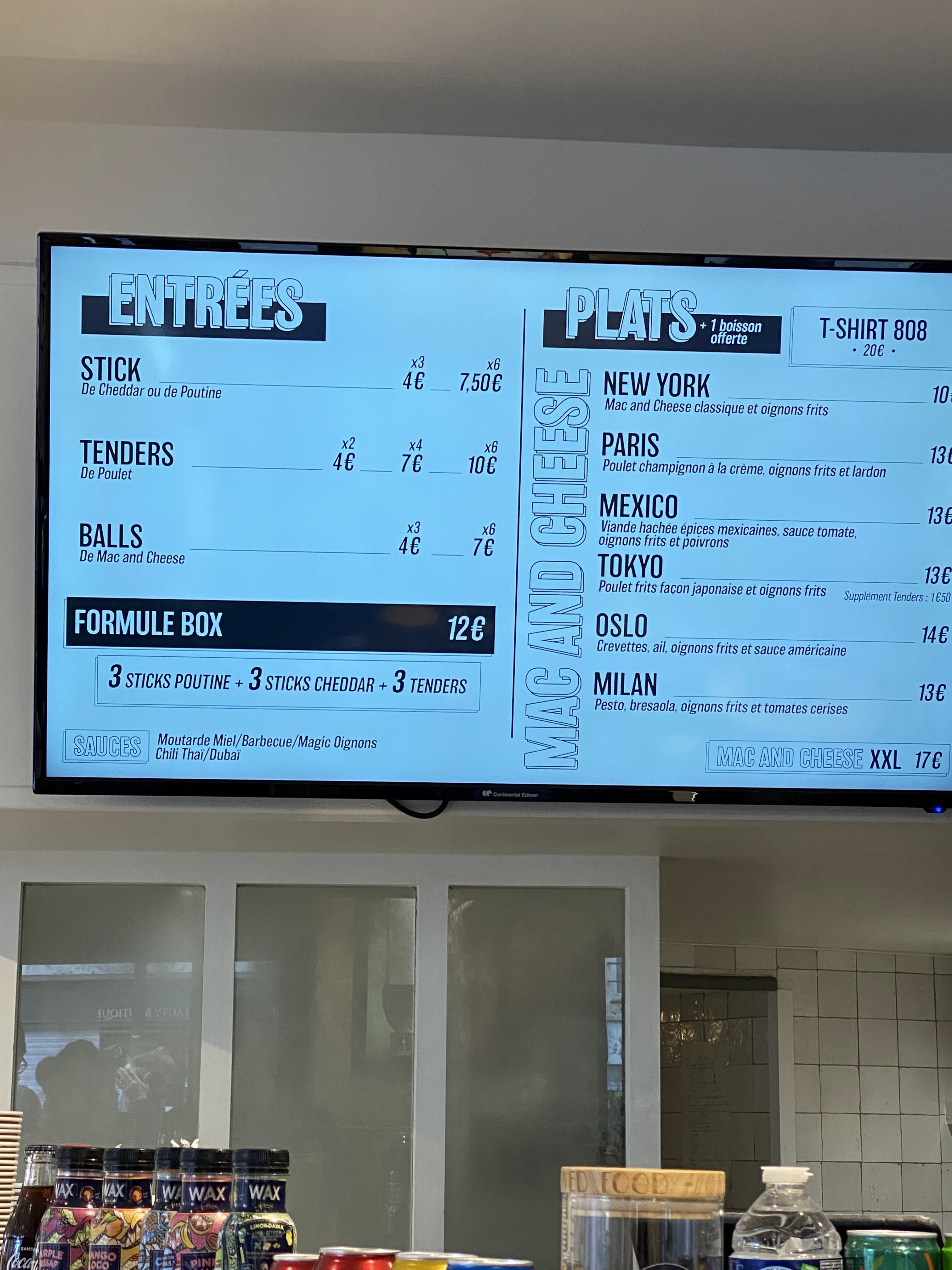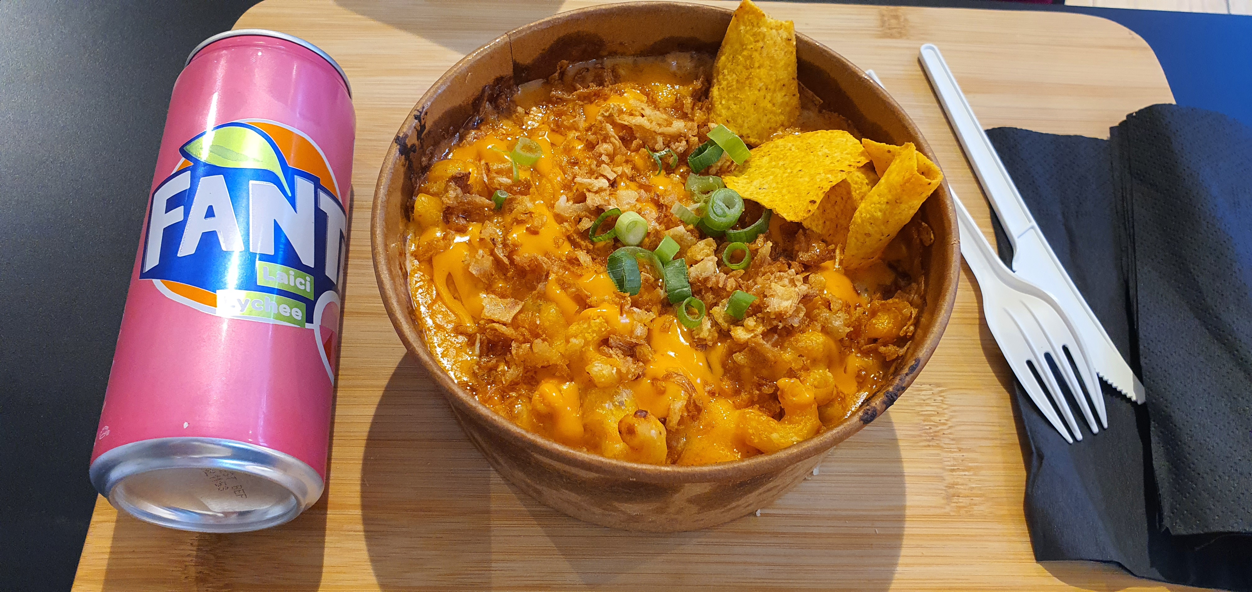 Fast-food original avec plusieurs sortes de Mac cheese proposés. L'ambiance est cool avec un peu de musique en fond, la serveuse est accueillante et agréable. Service avec biper, nourriture bien chaude portions généreuses. C'est quand même cher pour des pâtes et du fromage mais au final on oublie l'addition puisque c'est assez bourratif. Je vous conseille le Paris et le New York avec une sauce magic oignon et la Chili Thaï, Les Balls Mac Cheese sont super bonnes et originales. PS : manque la carte