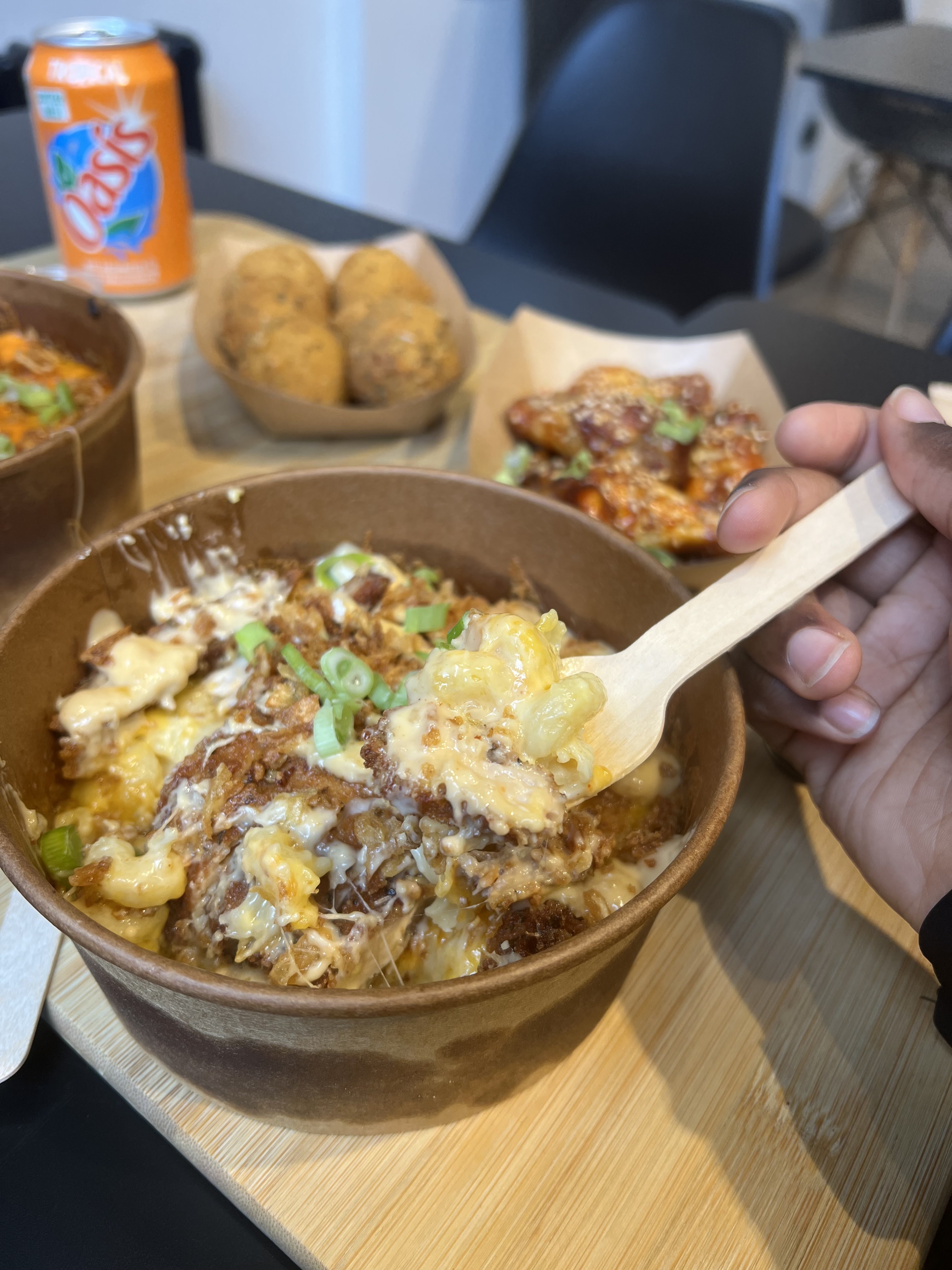 On s'est regalé ! Si vous aimez les mac and cheese foncez ! J'ai pris au poulet pané. Il y a de la place pour manger sur place.