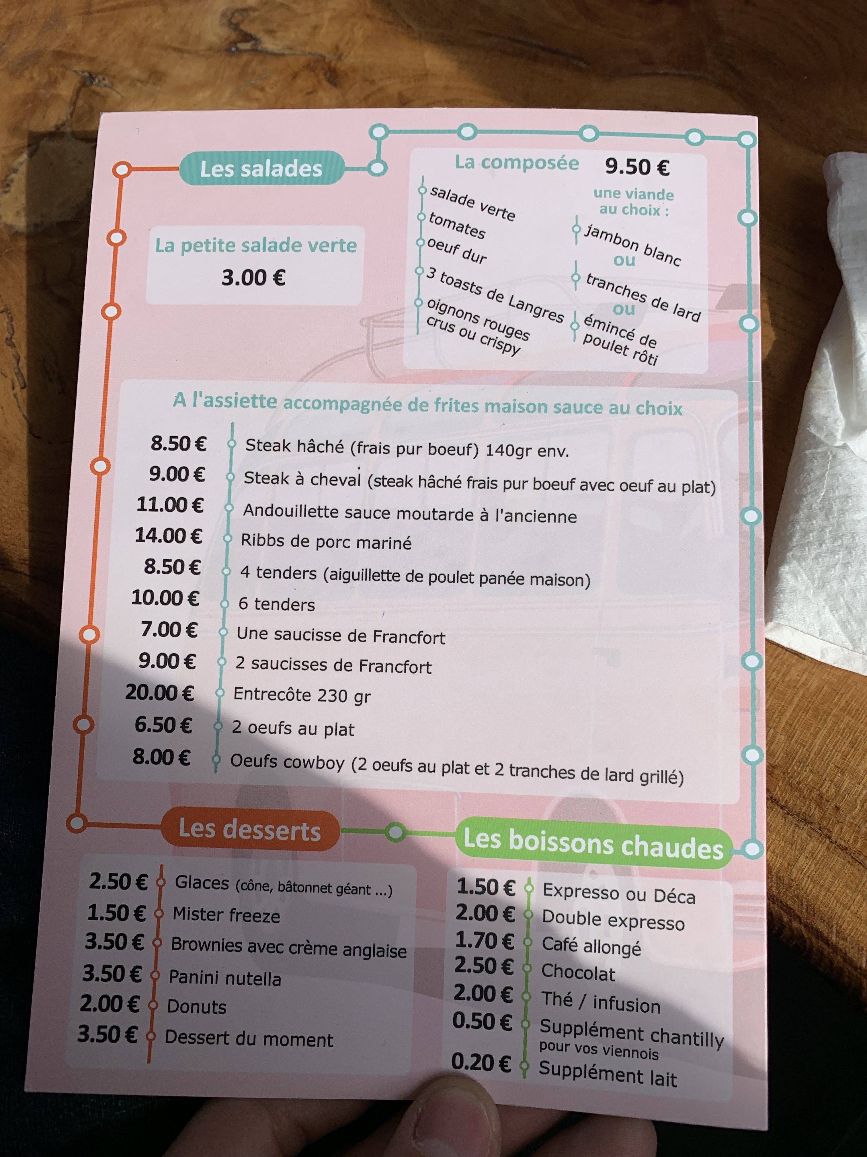 Adorable petite pause du midi, sortez donc de l'autoroute svp et arrêtez vous ici ! Un petit verre de vin blanc frais, chardonnay 2 € ! Des frites maison, un cadre surprenant, dans 1 bus, de la gentillesse et le respect du client pour un snack resto rapide, ou on s'attarde volontiers, plus longtemps que prévu...merci !