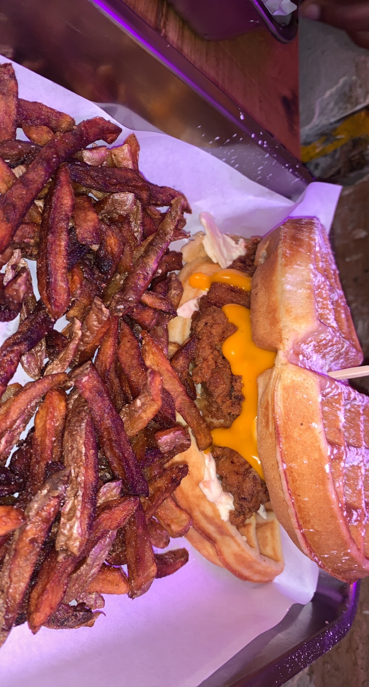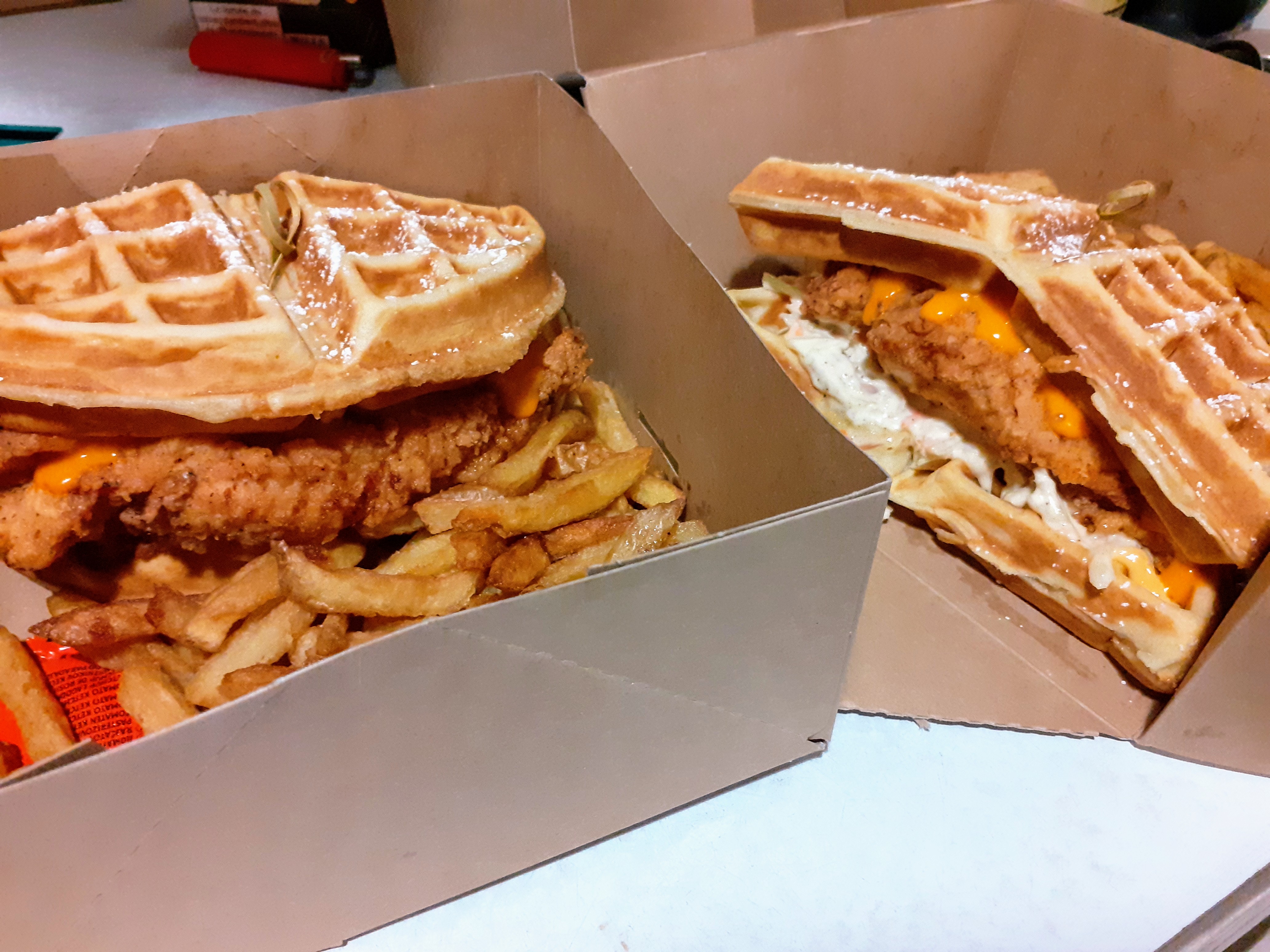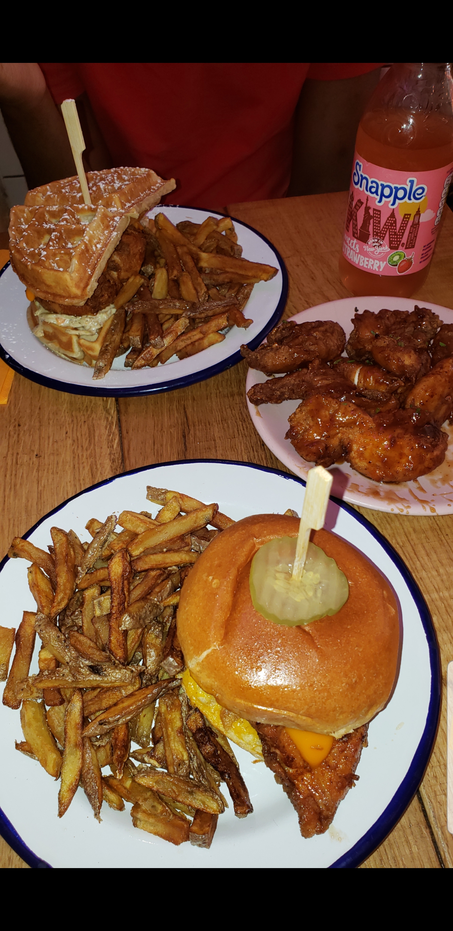 Gaufres bonnes mais le filet de poulet dans les burger est trop gros ca devient étouffant et il était pas du tout assez cuit. Pareil pour les poulet bien assaisonner mais encore rose à l’intérieur j’ai du bien chauffer pour manger. Mac and cheese pas bon. Faites gaffes a votre cuisson mais je reviendrais tester a voir.