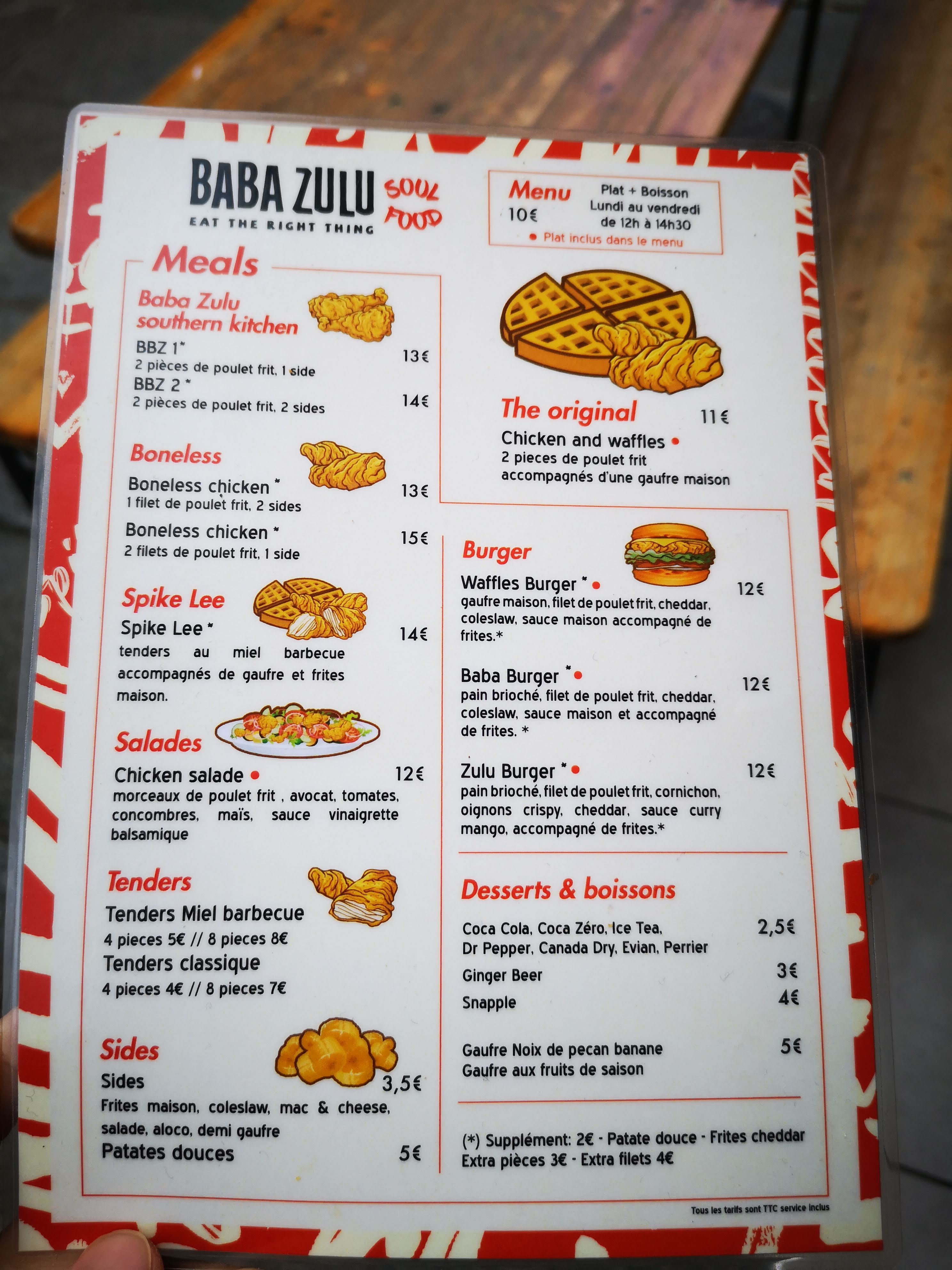 Avis perso, c'est plutôt bon, l'emplacement est bien car c'est entre republique et le canal st martin. Mais le goût n'est pas incroyable, le poulet est un peu sec pas trop épicé, banal et les gauffres sont assez fades.