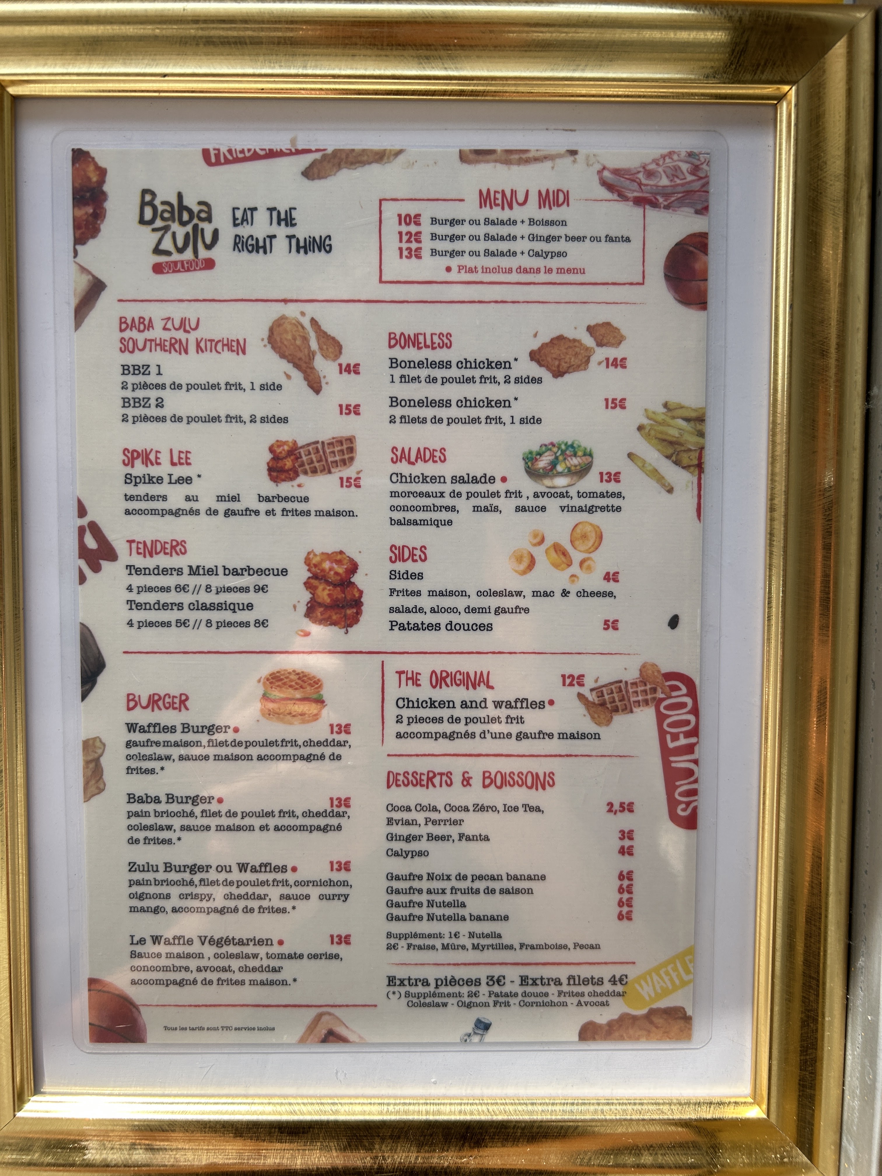 Super resto, abordable pour la qualité des plats. Un poulet parfaitement assaisonné, des gaufres et une sauce excellentes ! Seul bémol, peu de places assises pour se restaurer sur place, si comme nous, patienter vous fait grincer des dents, je vous recommande d’arriver à l’ouverture ou de commander à emporter !