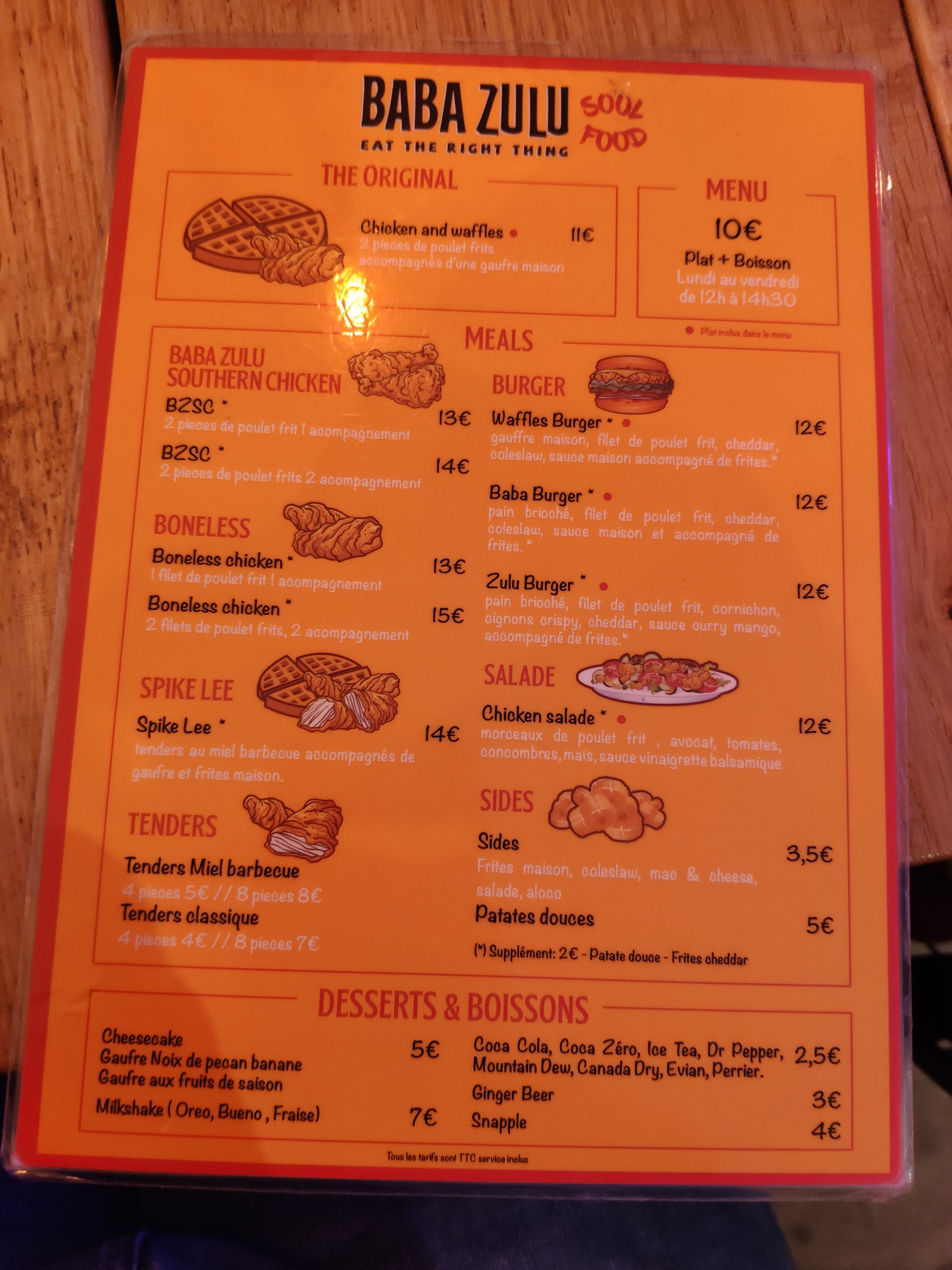 En cette période hivernale, l'envie dun confort food m'occupait l'esprit depuis un petit moment. Fan de Soul Food, et étant dans le secteur de République, il était logique que je test ce petit spot. Arrivé un samedi peu avant 20h, le restaurant était remplie à 80% (capacité total de 16 couverts environ). Nous étions seulement deux personnes donc assis rapidement. Ce qui ne fut pas le cas des clients suivant qui ont du patienter longuement (pour les plus courageux). L'acceuil est cool, le service efficace, avec une prise de commande rapide . Les mets commandés, ont été servi sans trop d'attente. Le waffle burger et baba burger en imposent dans l'assiette, on est clairement plongé dans l'ambiance Soul Food. Les plats sont accompagné de frites de patate douces, qui sont bonne mais un peu trop molle (dommage) Le waffle est bon, et la combinaison avec le poulet passe en douceur. Par contre le fried chicken, à une panure basique, rien de grandioses en bouche (Cest la même pieces qu'on retrouve dans le Baba burger). Les sauces accompagnant ces deux plats, sont des sauces de la très grande marque américaine H...z, et seront plus ou moins appréciés selon les goûts de chacun. Perso, j'aurais apprécié quelques sauces maison, qui je pense auraient pu donner un peu plus d'identité collant à l'esprit Soul food et surtout des saveurs plus intense. Un petit point noire à noter tout de même, le fromage (cheddar) que nous attendons tous dans ce genre de plat, est malheureusement substitué par une simple sauce fromagere type cheddar, beaucoup moins goutu en bouche et qui n'apporte malheureusement pas assé de caractère lors de la dégustation. Ah oui , tout de Même un big up aux Sweet chicken TenderS qu'on valide totalement !! Yummy!! En clair, un petit restaurant avec une ambiance sympathique, des plats copieusement bon sans être transcendant et en adéquation avec les prix proposés. L'équipe vraiment cool, que j'encourage ++ pour la suite!