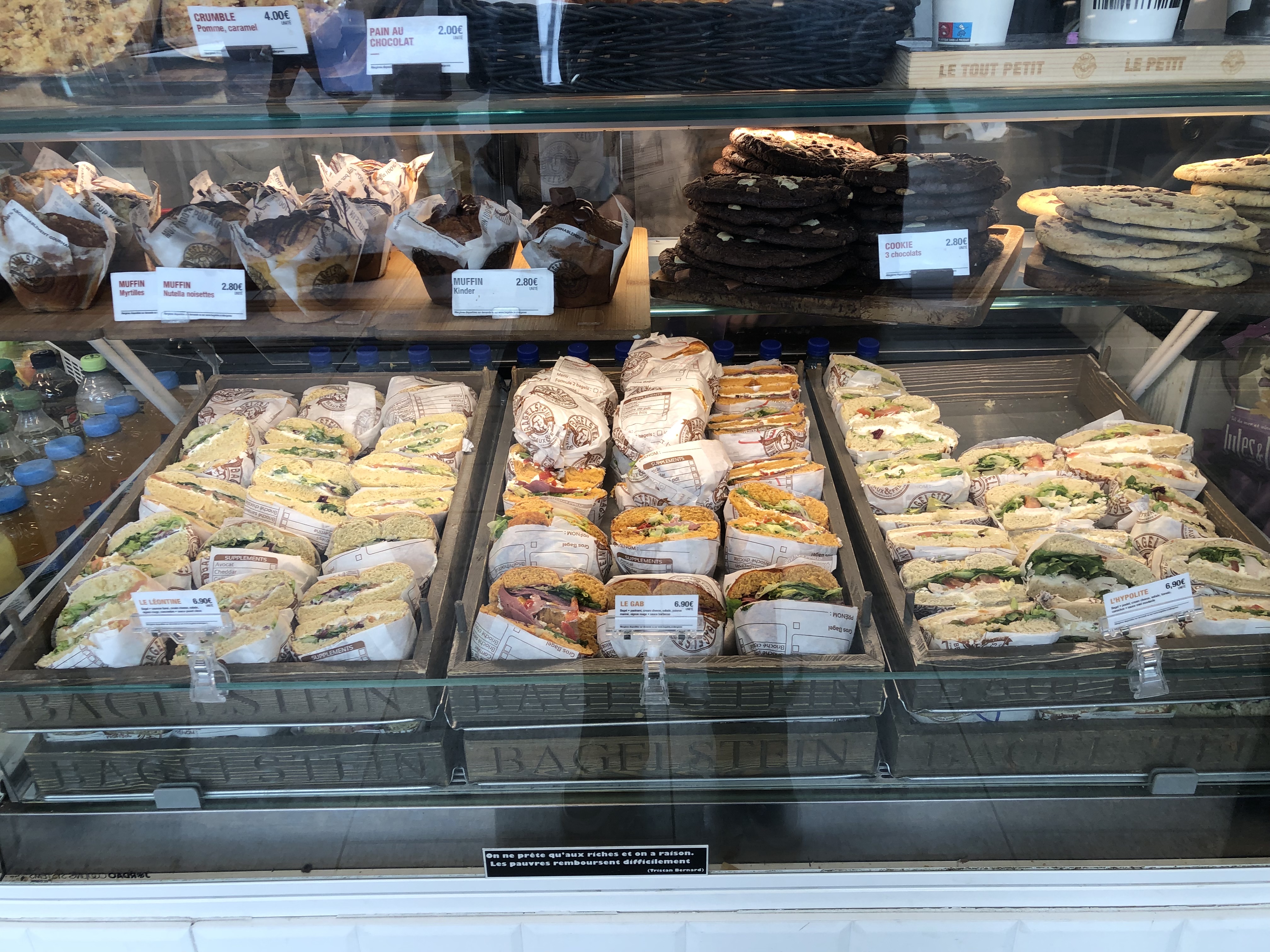 Habituellement j'adore aller chez Bagelstein mais je ne remettrai pas les pieds à celui de la gare Montparnasse ! Tout d'abord, les bagels sont préparés à l'avance, ce qui ne permet pas de retirer un ingrédient qui nous déplairait. Deuxièmement, j'avais commandé un bagel au saumon et, oh surprise en ouvrant mon sachet dans le train : c'est un bagel au poulet ! Évidemment pour le prix de celui au saumon ... Quelle joie d'y trouver des tomates et cornichons alors que je n'aime pas ça ... Franchement honteux de faire pareille erreur !