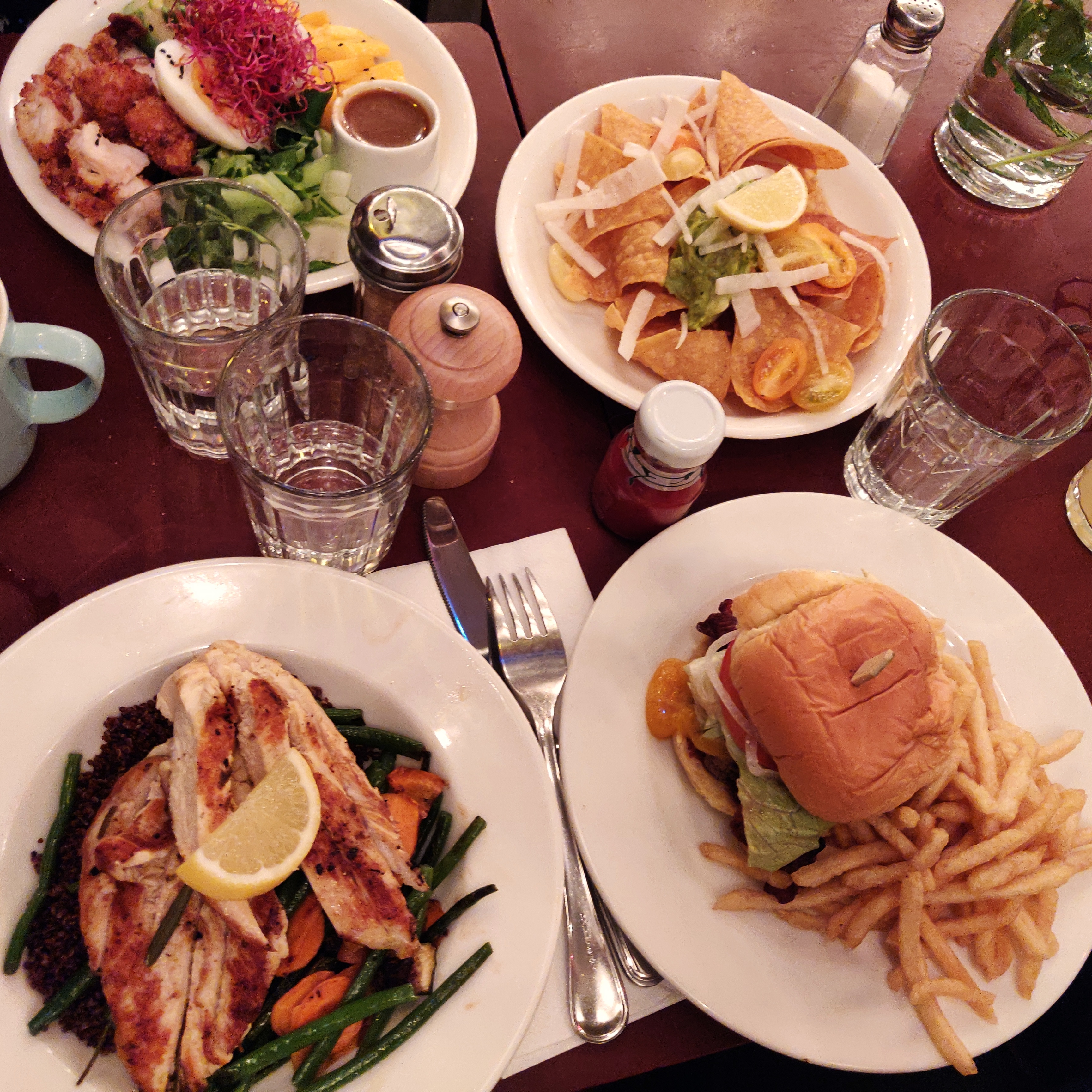 Endroit agréable, service sympathique, plats bons mais le burger/frites n’est pas assez généreux a mon goût, pourtant je suis pas une grande mangeuse…