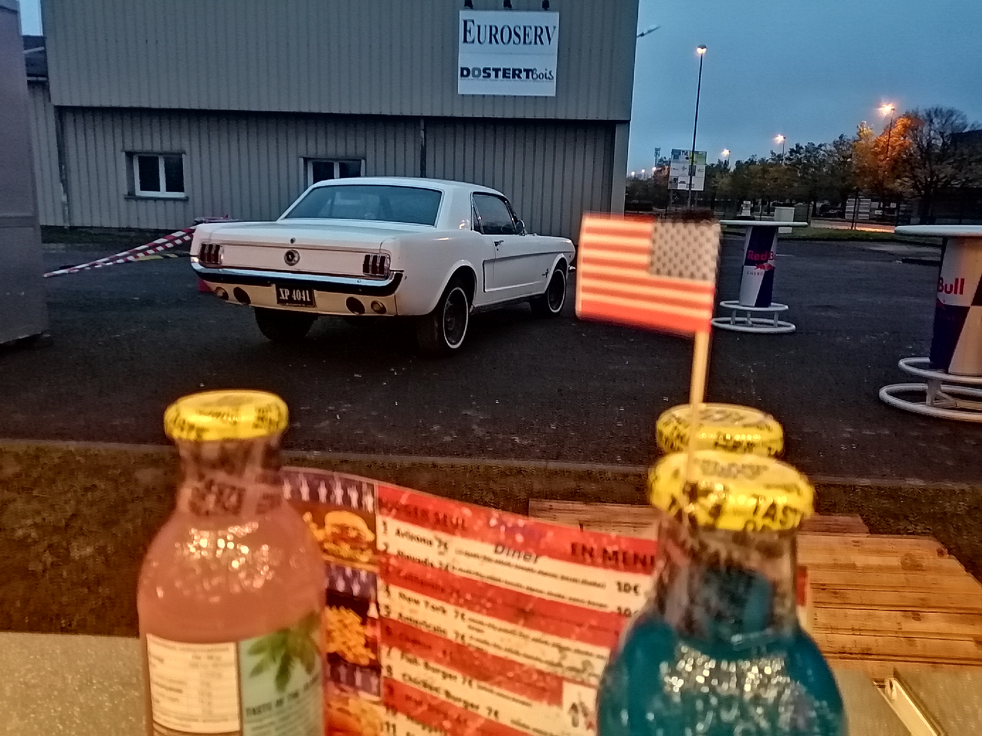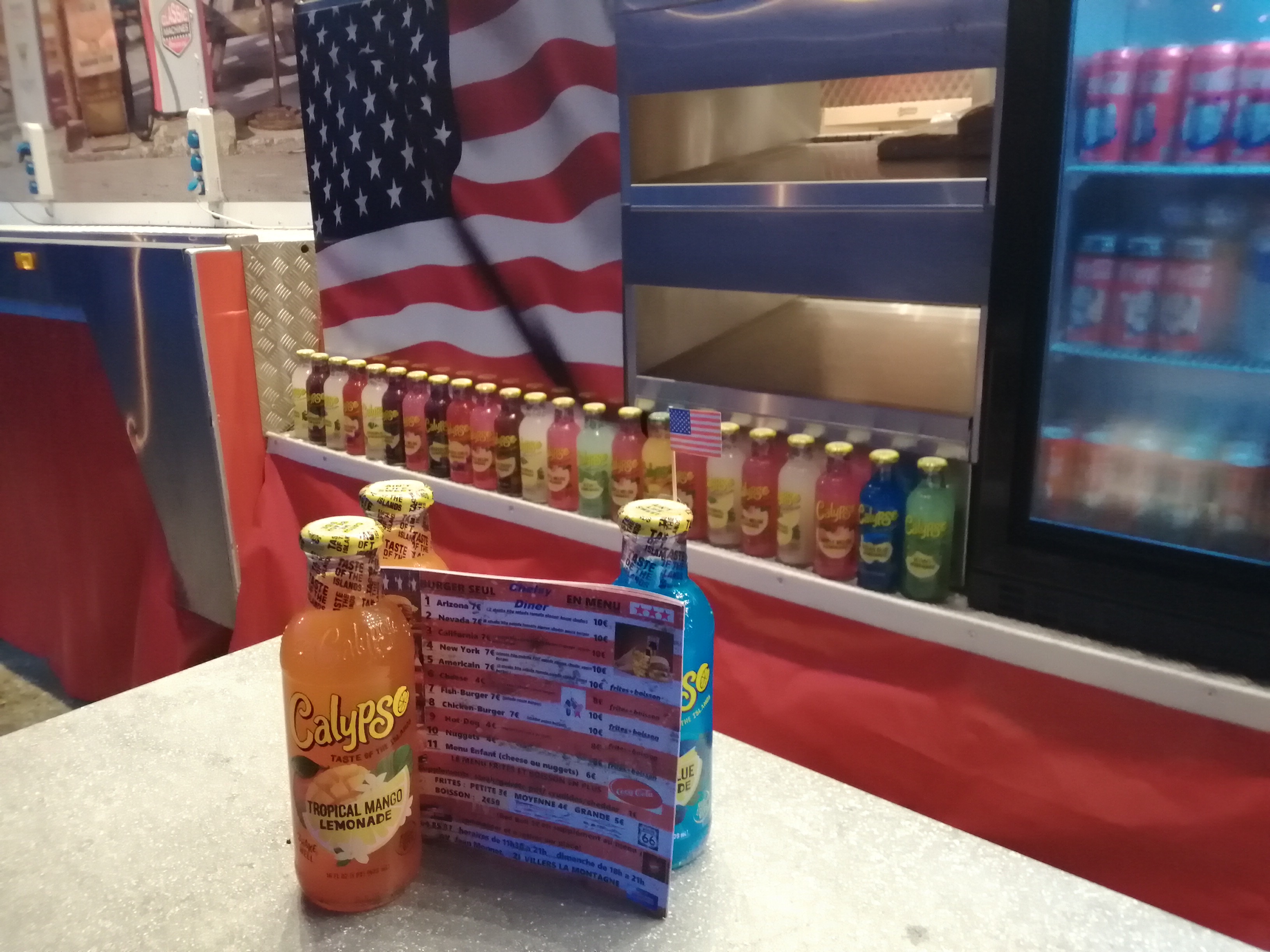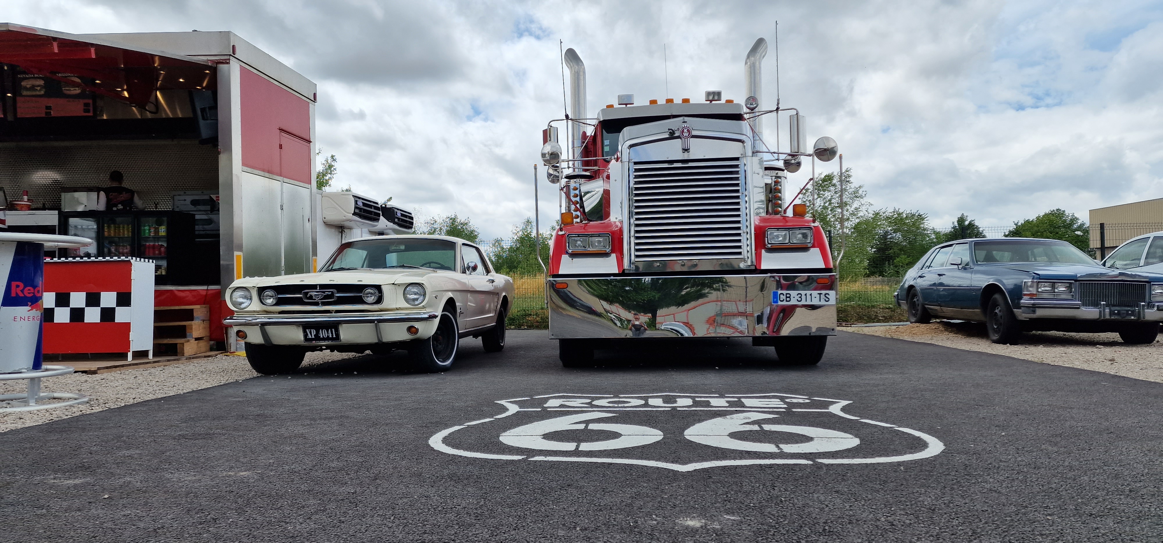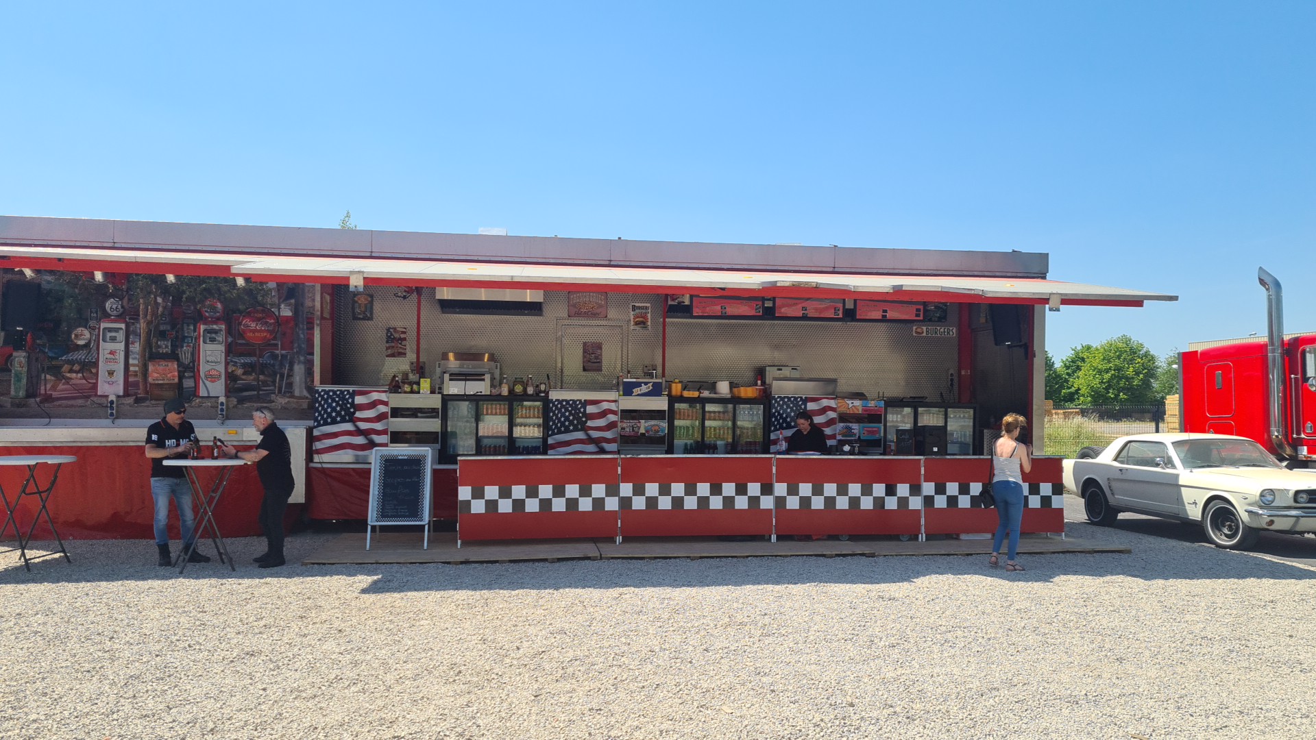 Bonne nourriture et personnel sympathique Quartier calme + sièges ombragés Pour ajouter à l'ambiance américaine du restaurant, il y a des véhicules à côté qui comprennent : - une Ford Mustang -une Cadillac Séville -un camion Kenworth