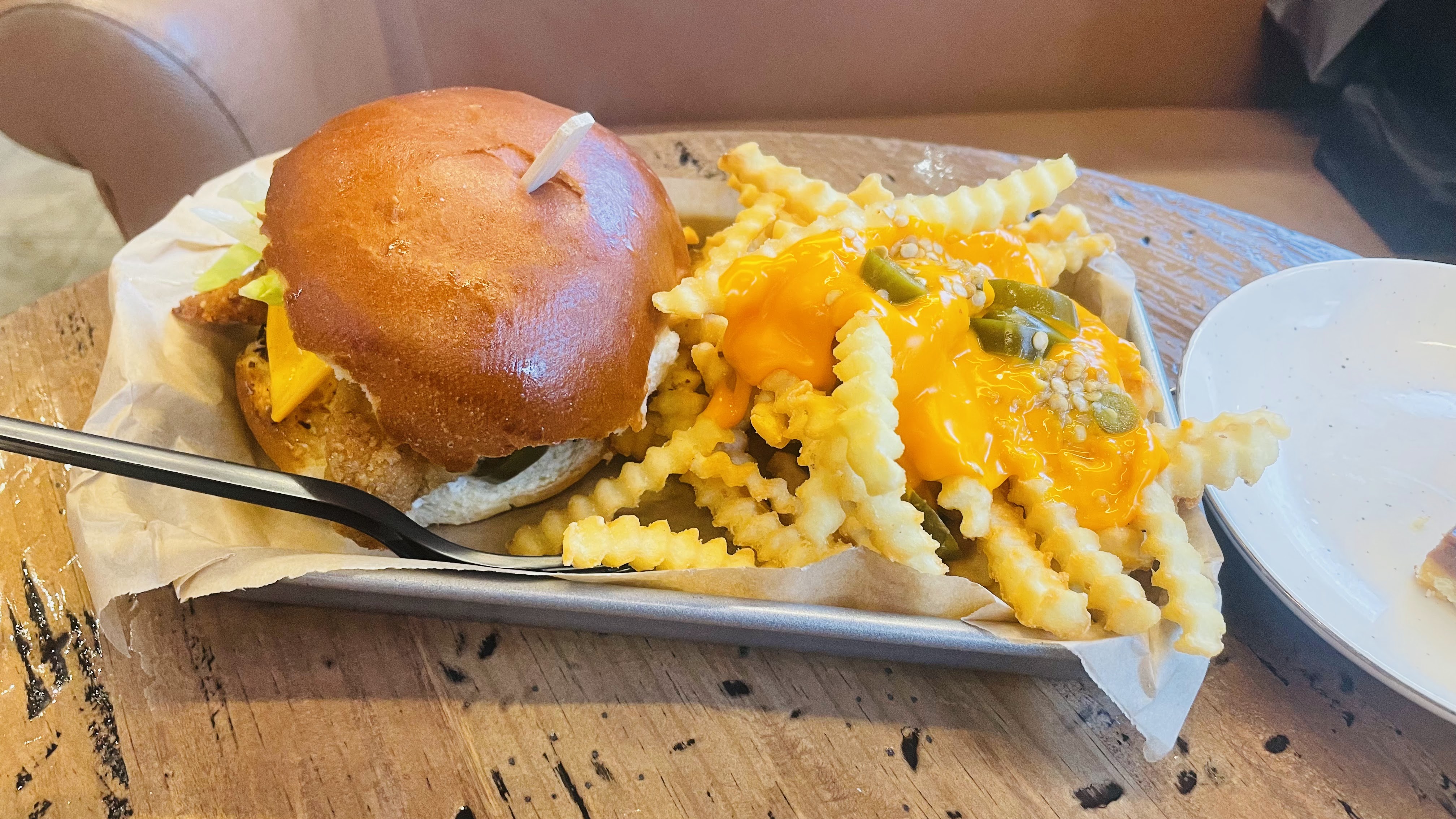 Burger très garni et généreux, la viande (poulet) a une très bonne cuisson et on sent chaque ingrédient, ce qui le démarque des autres enseignes burgers ayant ce fort gout de sauce et fromage en bouche. L'étoile en moins concerne le Bagel consommé par mon acolyte, celui ci est un pain décongelé. Jusqu'ici rien d'affolant puisque le décongelé peut être considéré comme du produit frais, mais veiller à ce que la texture ne change pas et que l'on ne remarque pas qu'il sort du congélateur. Formule à 16eu50 qui comprend Burger/frites(de patate douce si souhaité)/dessert/boisson