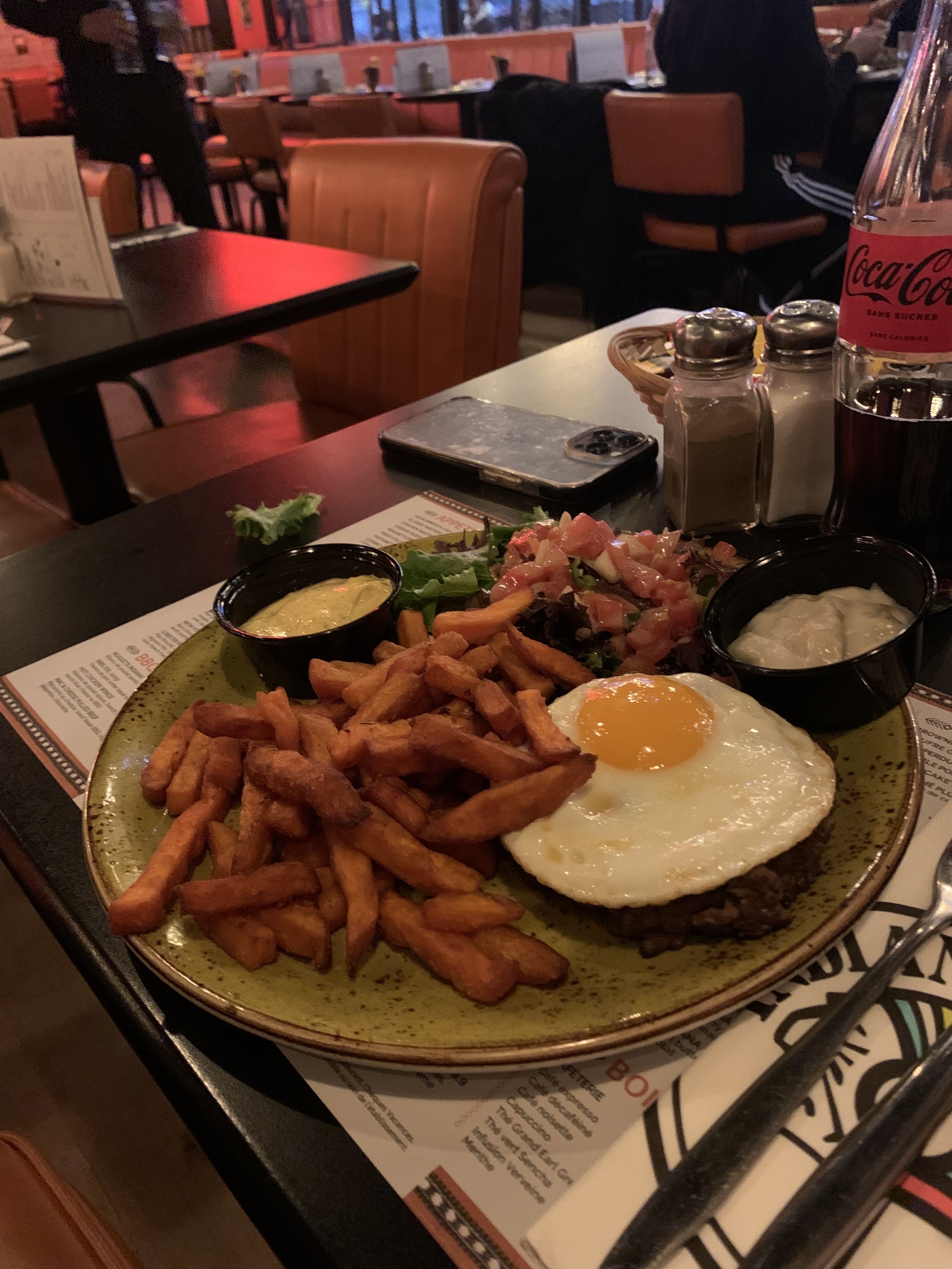 Nous venons de très bien manger. Nous avons commandé des calamars frits et des beignets de fromage, excellent, nous avons mangé un steak à cheval avec un œuf et un fichandship,très très bon. Très bien servi. À refaire, nous ne sommes pas déçues. Merci et le gérant est très sympa. Les serveurs aussi. MERCI À VOUS, CONTINUEZ.