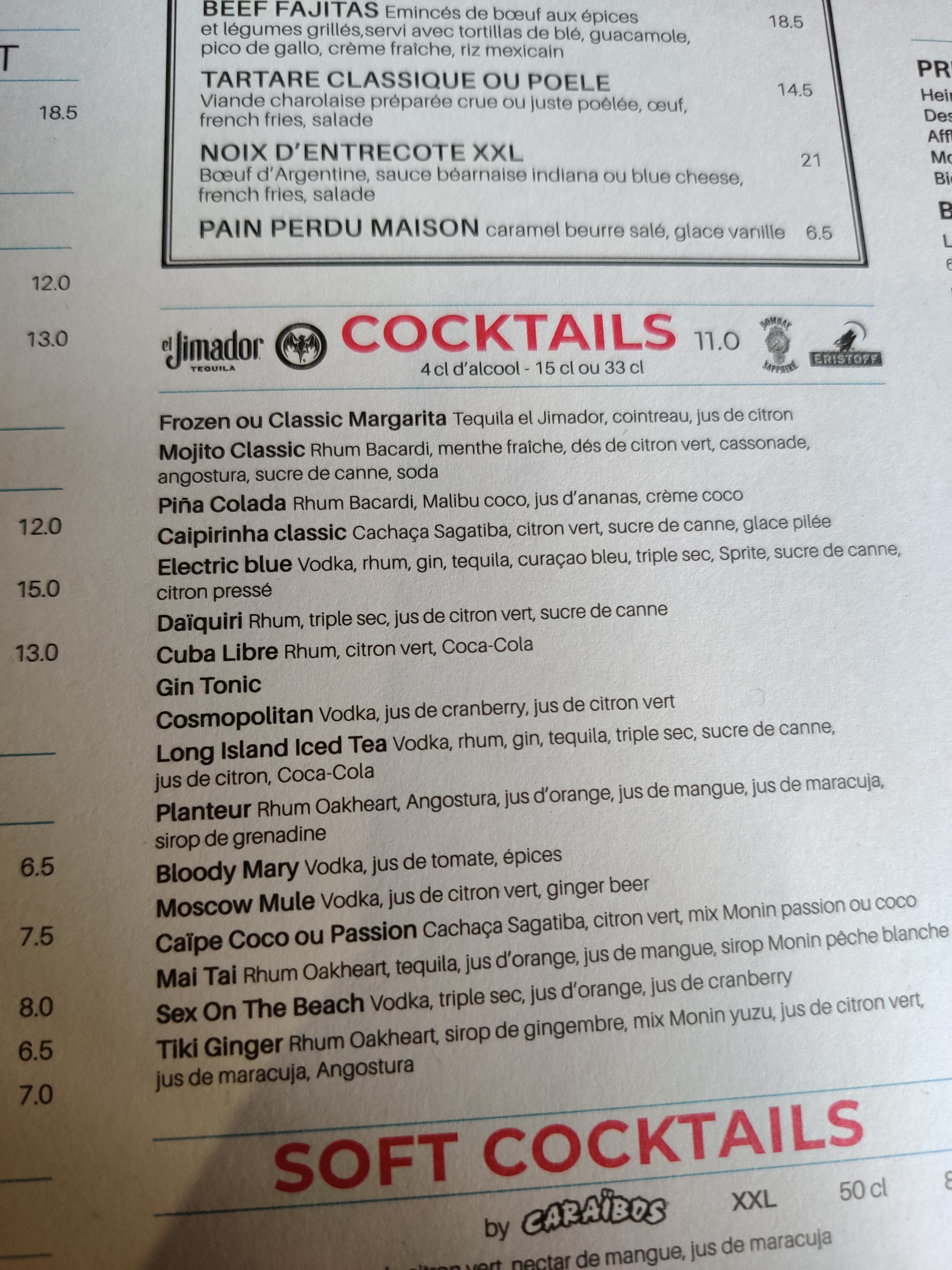 On a surtout envie de venir pour le personnel qui est tres charmant qui se montre naturel avec le client le service tres bien mais qualite de la nourriture deplorable desole je prefere marcher la concurrence. Juste en face de chez vous delicieux burger et prix corrects. Les boissons les cocktails les prix ont flambes desole je prefere les boire chez moi. J’espere que cette info sera remontee tres cordialement