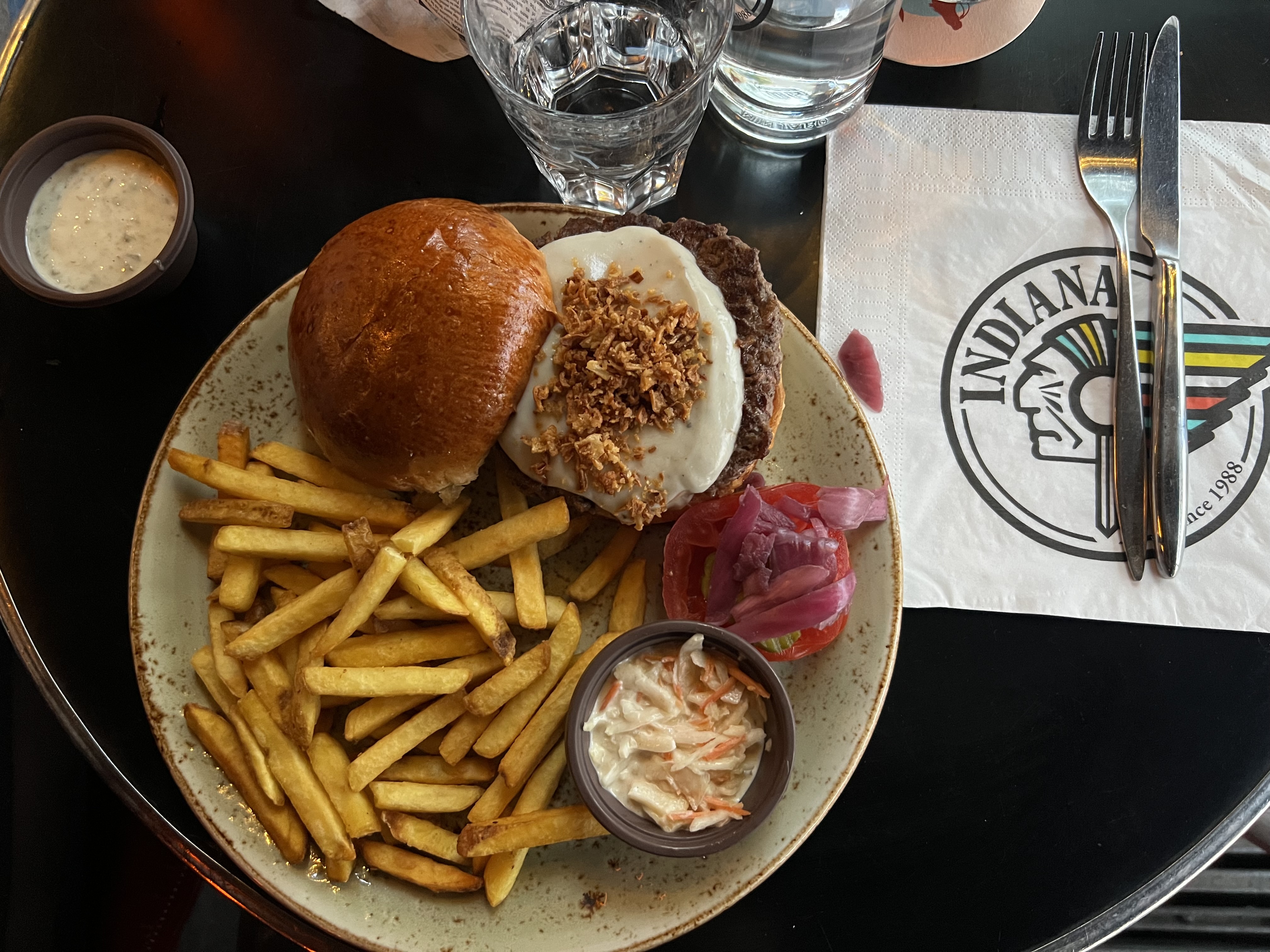 Un repas décevant contrairement aux autres Indiana. Fish burger à éviter, poisson pané industriel, bun's sans saveur et sauce goût chimique. Le comble : ma femme demande un jus d'oranges pressées en voyant les oranges sur le bar. Réponse de la serveuse : on ne peut pas vous presser un jus d'orange parce qu'on a pas le temps de laver le presse agrumes !!! Par contre ils vendent des smoothies... La salle est petite, la terrasse sur le trottoir, pendant le dîner le voisin du dessus arrose ses plantes et ça inonde une partie des tables extérieures RIDICULE.