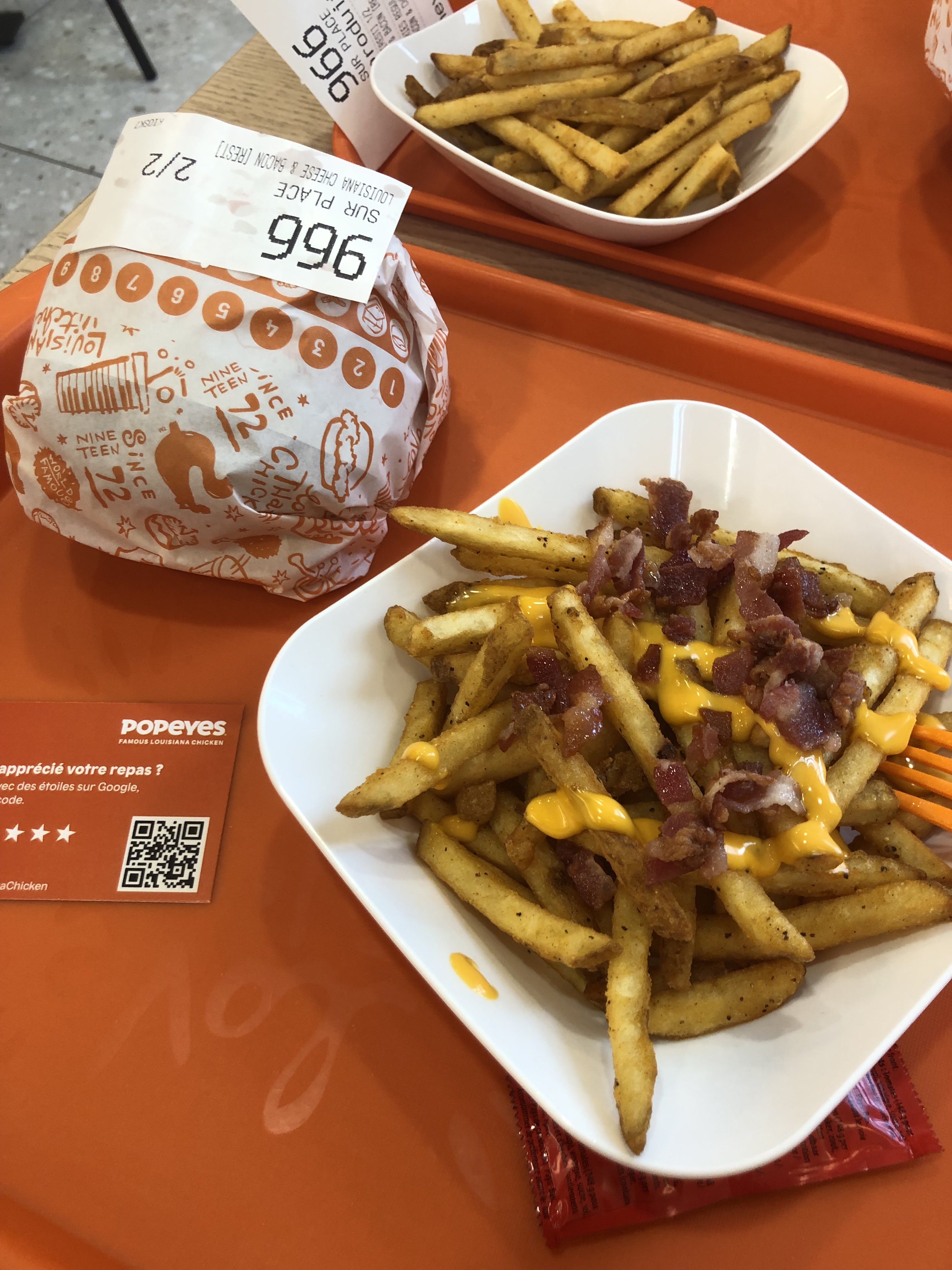 Popeyes c'est le concurrent de KFC par le groupe qui détient Burger King. Vous ne serez donc pas dépaysés par la déco du même style, les bornes et les descriptions des produits. Lors de ma dernière visite, j'ai trouvé le poulet de mon hamburger plus gras que d'habitude, sinon c'était plutôt bon (ça reste du fast food). Mention spéciale pour les frites et leurs épices cajun ! J'ai adoré. Et la possibilité de choisir le degré de piquant de vos plats (de 0 à 3 piments). Les + : - L'équipe est très polie et serviable. - Le service est divisé en deux comptoirs ensuite : un comptoir pour régler les commandes en espèce et retirer les glaces, cafés... si vous mangez sur place. Et un autre comptoir avec les paiements et retraits commandes à emporter. - Salle lumineuse et propre. Extérieur sympa. - Grande aire de jeux pour les enfants - Chaises hautes à disposition - Système de recyclage avec les bornes de tri. Les - : - Je n'ai pas trouvé de borne pour recycler les canettes en alu. - La clim peut-être ultra forte et sous les bouches de ventilation, ça peut vite devenir désagréable.