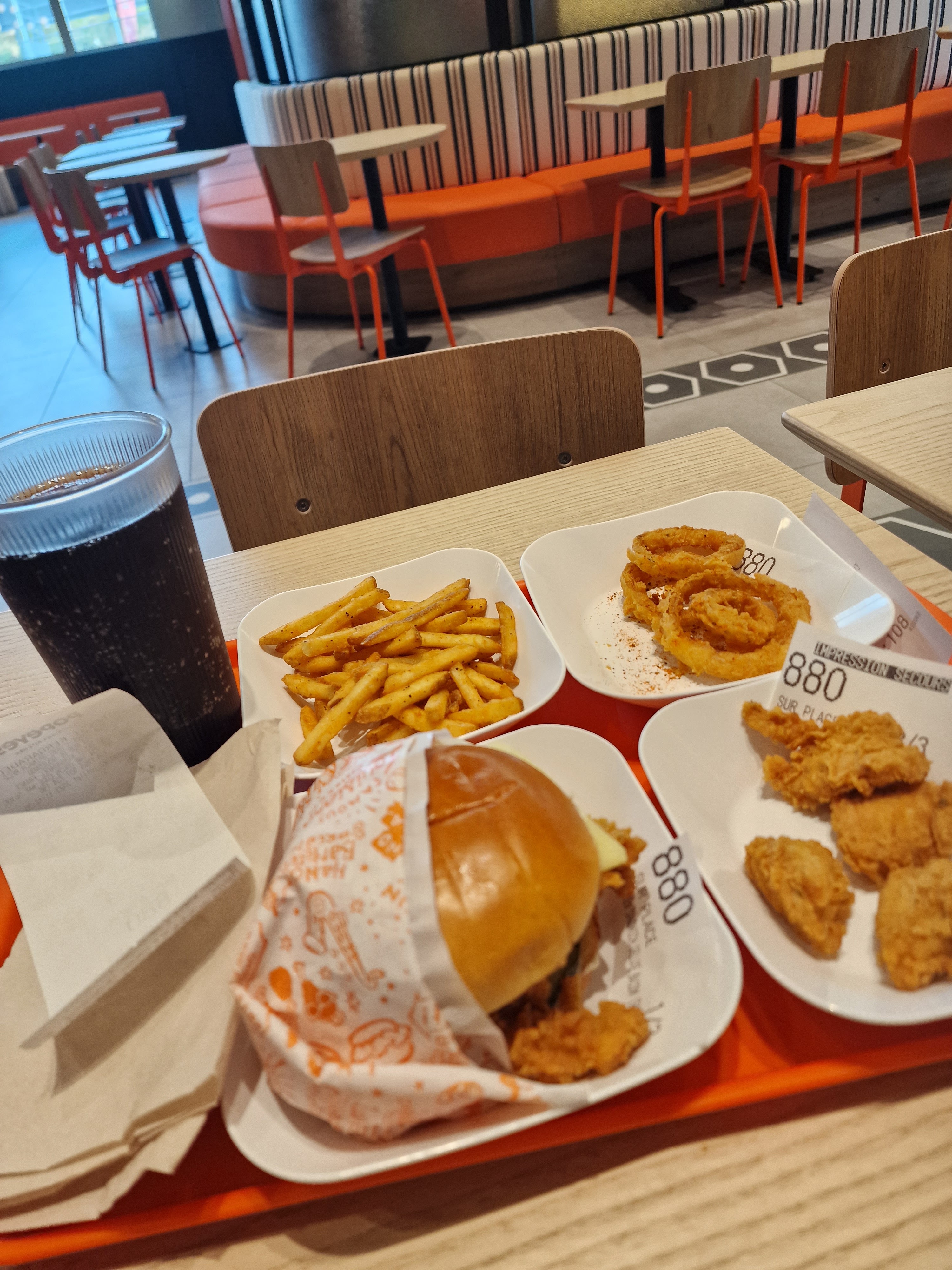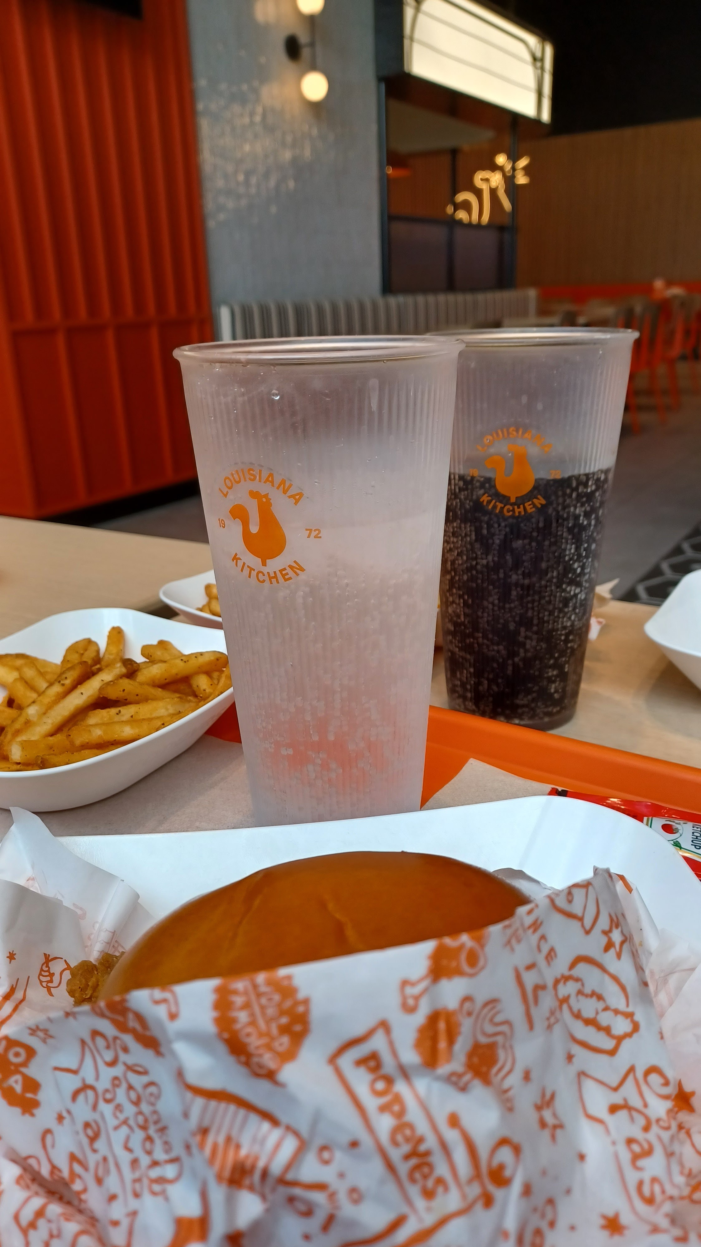 J'ai essayé le Popeyes pour vous : la terrasse est bien dégagée ; la couleur orange prédominante de l'ensemble est très lumineuse et vous donne une ambiance chaleureuse. Si vous avez envie de voyager en Louisiane vous le pourrez à travers les différentes formules proposées et la musique qui passe en fond sonore. Le personnel est aux petits soins de ses clients. Pour les personnes à mobilité réduite vous avez sois une entrée avec ascenseur ou une entrée PMR. Aussi je vous le recommande vivement si vous avez une petite faim et aimer les spécialités au poulet ou encore veggies ou tout simplement envie de changer de fast-food.
