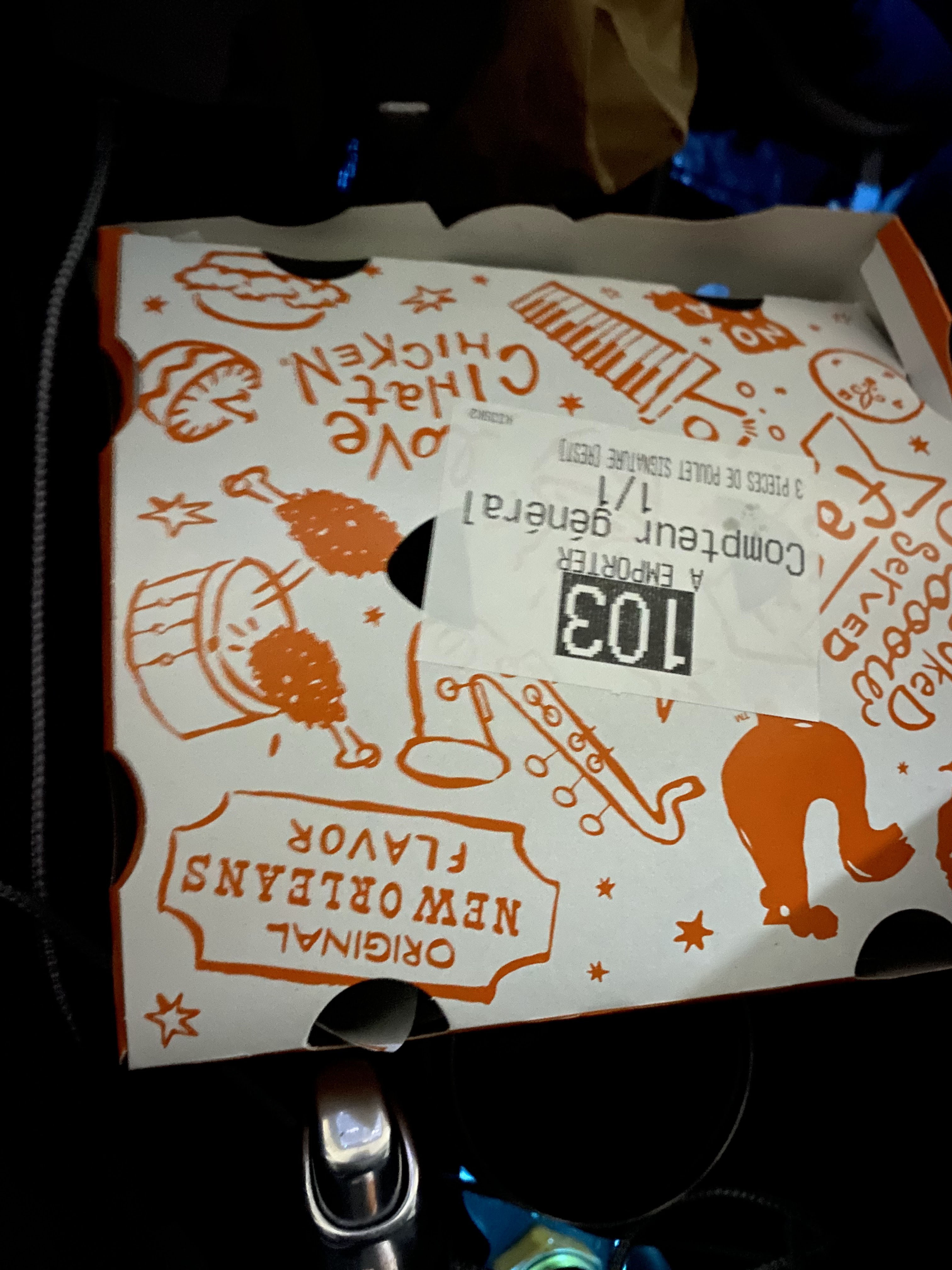 Pire fast food, employés dépassés, les livreurs à la chaîne qui attendent et réclament leurs commande dans le restaurant. Un gugusse au milieu en gris qui dit à tout le monde ça arrive. Merci au revoir popeyes !