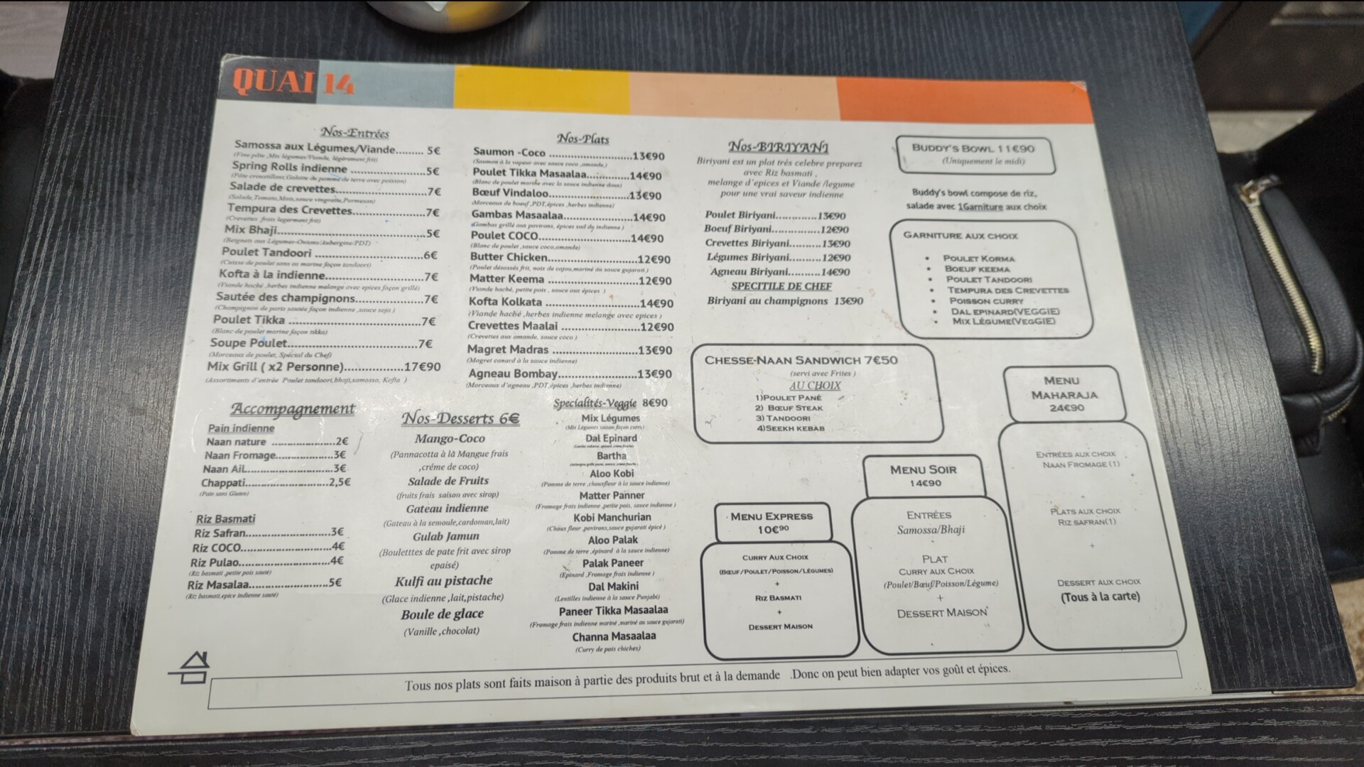 Cuisine indienne pas très authentique et service hyper lent alors que nous n'étions que 2 tables à servir. Terrasse très agréable au calme.
