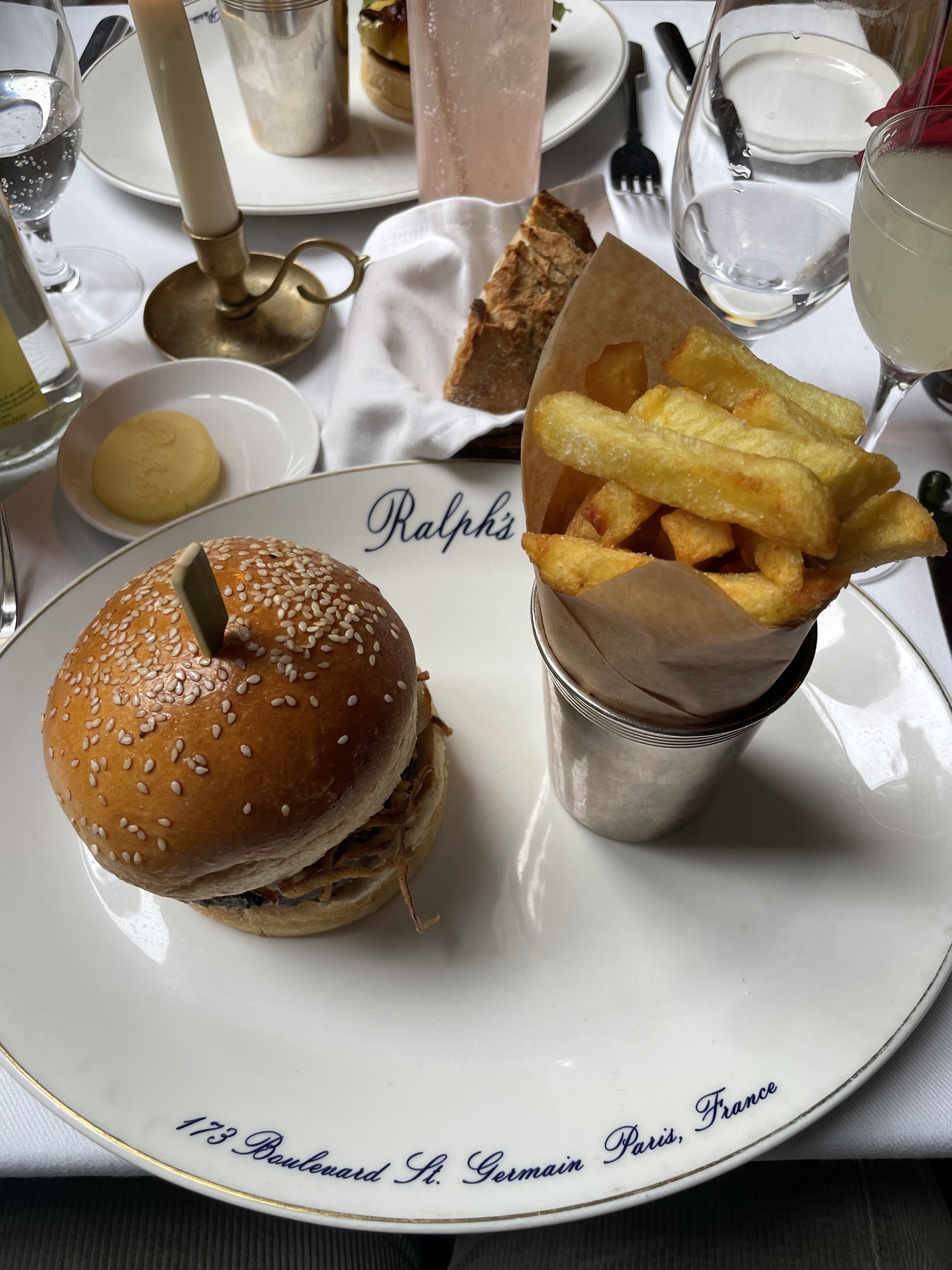 Toute l’élégance de Ralph Lauren dans son restaurant et plus précisément sa terrasse. Dans la cour de cet hôtel particulier du XXVIIIéme siècle en plein St Germain des prés, on s’installe dans des petites banquettes autour d’une table joliment dressée. Les serveurs et serveuses très jeunes dans leurs tenues classiques de la marque s’occupent de vous avec attention. Ici point de cuisine gastronomique , la spécialité c’est le burger Ralph’s accompagné de frites et pour lequel je vous conseille un verre de Zinfandel rouge c’est celui de FF COPPOLA pour l’accompagner. Nous avons eu de la chance pour la table il est préférable de réserver et il y a un voiturier. Enjoy.