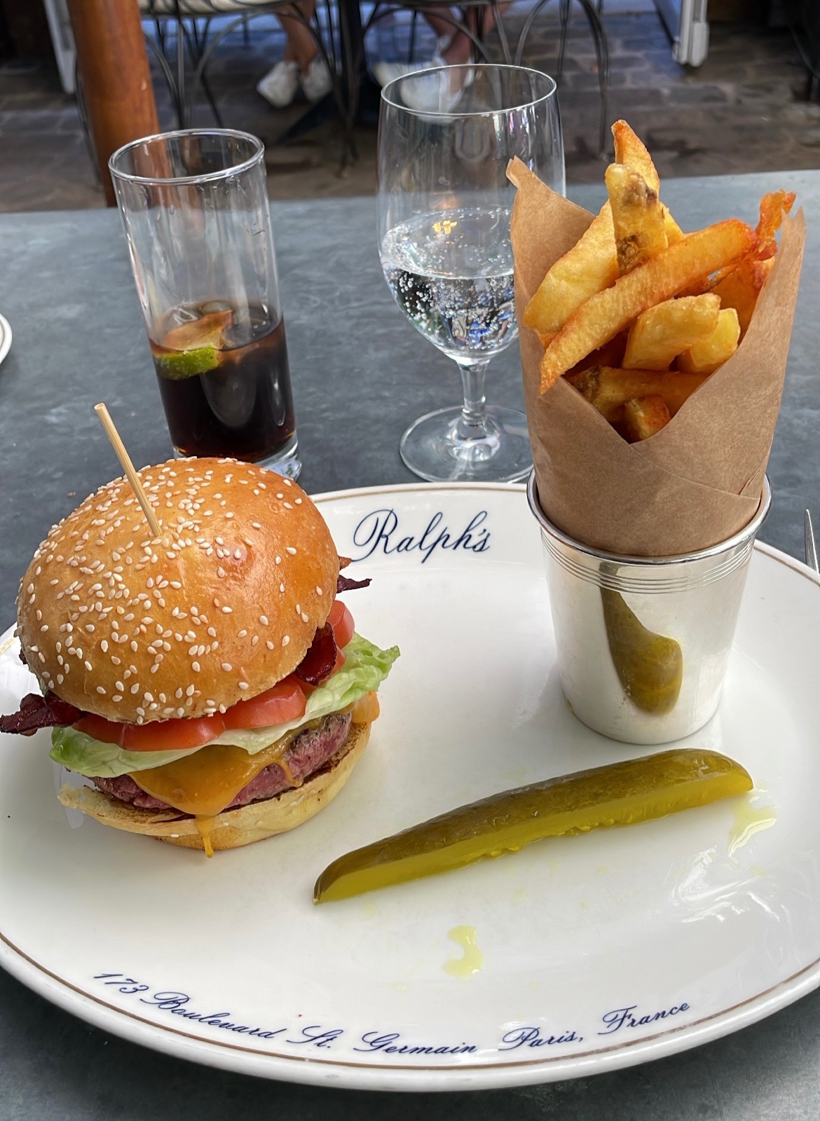 Que dire de ce restaurant so chic avec sa terrasse tendance particulièrement en été. Nous y sommes allés avec une amie après qq temps il y a de cela deux mois.Spritz saint germain ,petits canapé au saumon et un Ralph Burger à tomber c est à dire cuit à point bacon impeccable et pain non carbonisé. Nous y sommes retournés il y a qq jours .Spritz noyé dans des glaçons installés à l extérieur sans chauffage extérieur et sans petite lanterne en revanche un robinet ouvert faisant office de cascade à promite de nous alors que le temps était humide .Pourqupi pas? Il à fallut réclamer des olives et des pop corn.Nous faisons part de notre déception au serveur concernat le spritz alors que ,nous étions sur le point de partir .Il nous propose de refaire les boissons et par la suite nous propose de nous ramener la liqueur et d en rajouter nous même à notre convenance.Je rêve? Nous sommes chez Ralphs! 31 euros le sritz! Noudecidons tout de même de rester dîner le hamburger absolument pas à la hauteur de celui que nous avions mangé il y a deux mois .A point ne signifie pas carbonisé tant le pain que le steck. J ignore ce qui s' est passé et pourquoi ce manque d'attention .Changement de cuisinier?Nous décidons de ne pas prendre de dessert je demande un café et la les pop corn caramélisées arrivent avec. Peut être le lot de consolation?.Avant de partir j échange avec le serveur en lui disant que j ai vécu à Miami et la il me sort :Alors vous connaissez la bouffe américaine! Je lui dit: Oui mais ici nous sommes chez Ralph's! On dit jamais deux sans trois mais on ne m y reprendra plus! .Dommage pour une telle renommée!
