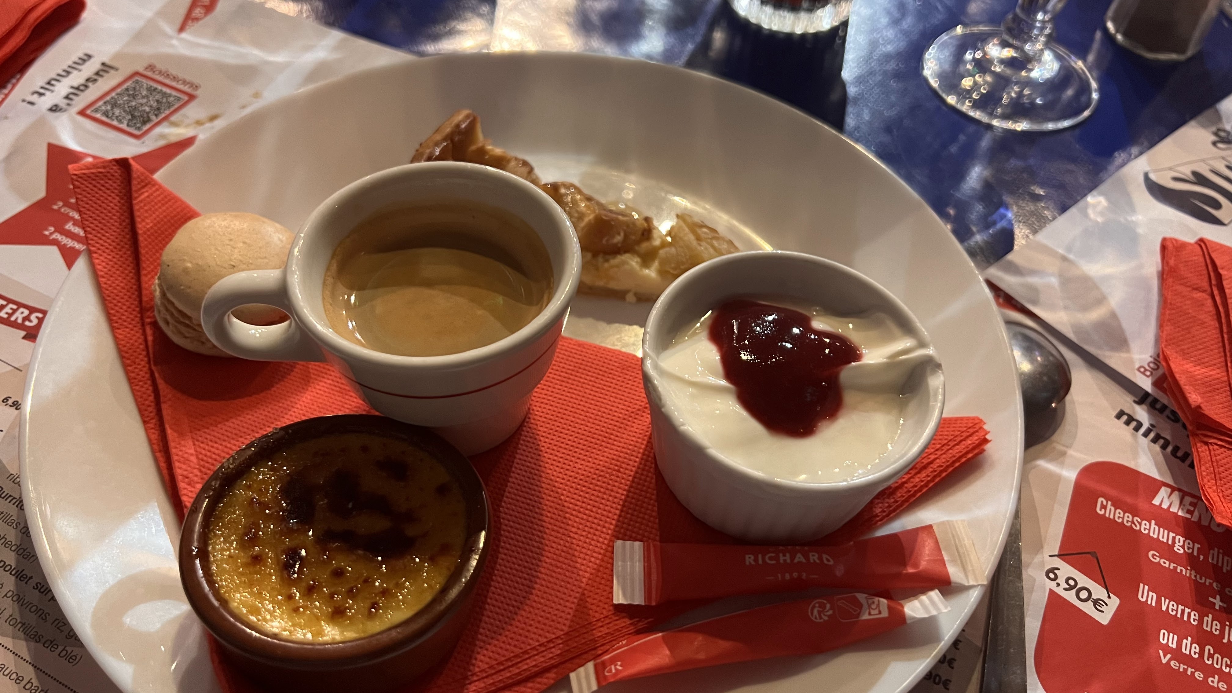 Un repas copieux pour un prix abordable ! Petit équilibre des sauces à voir : hamburger simple n'a aucune sauce (mais des sachets de sauces sont proposés) et le cheeseburger coule de fromage. Mais sinon délicieux !