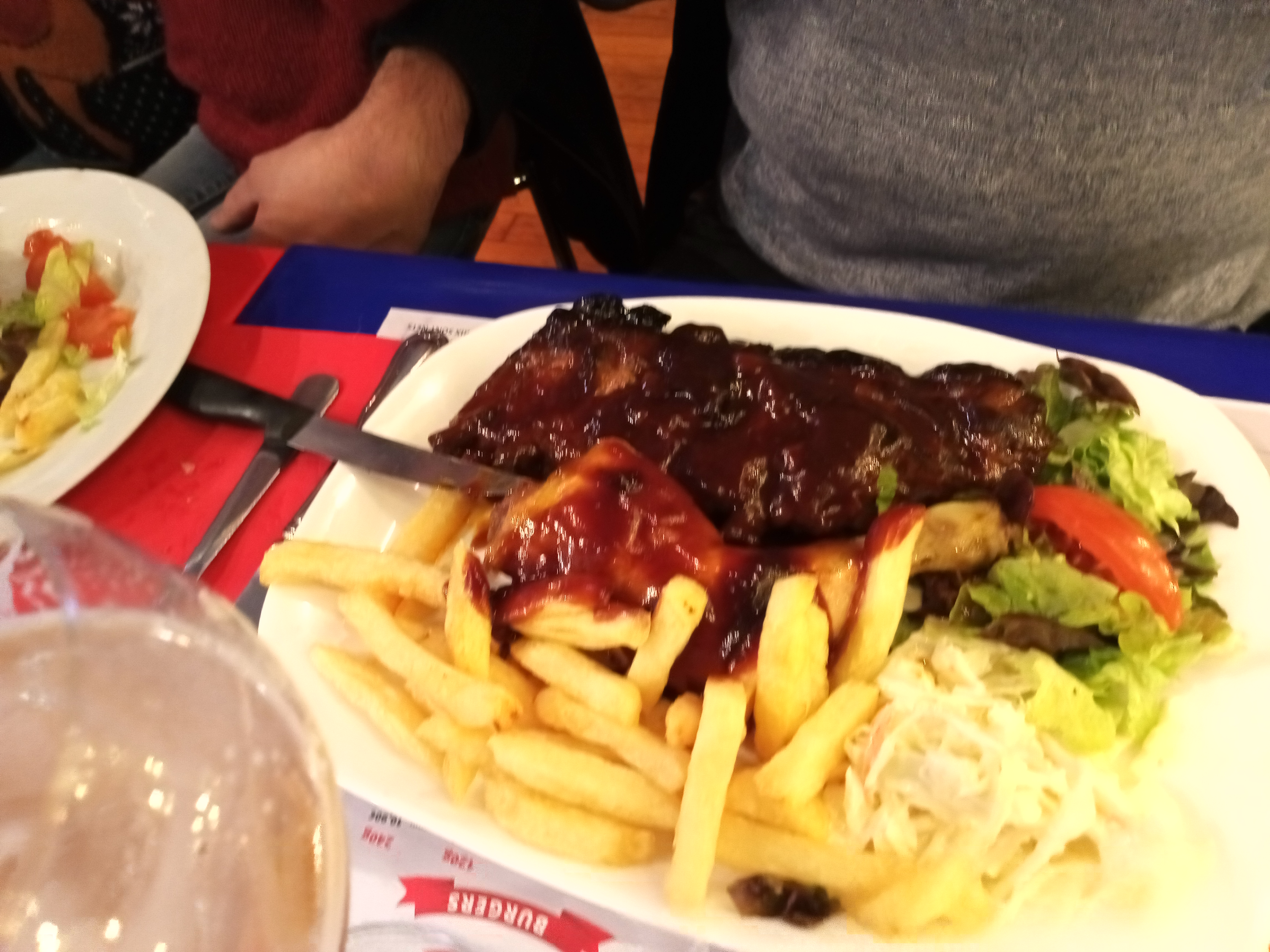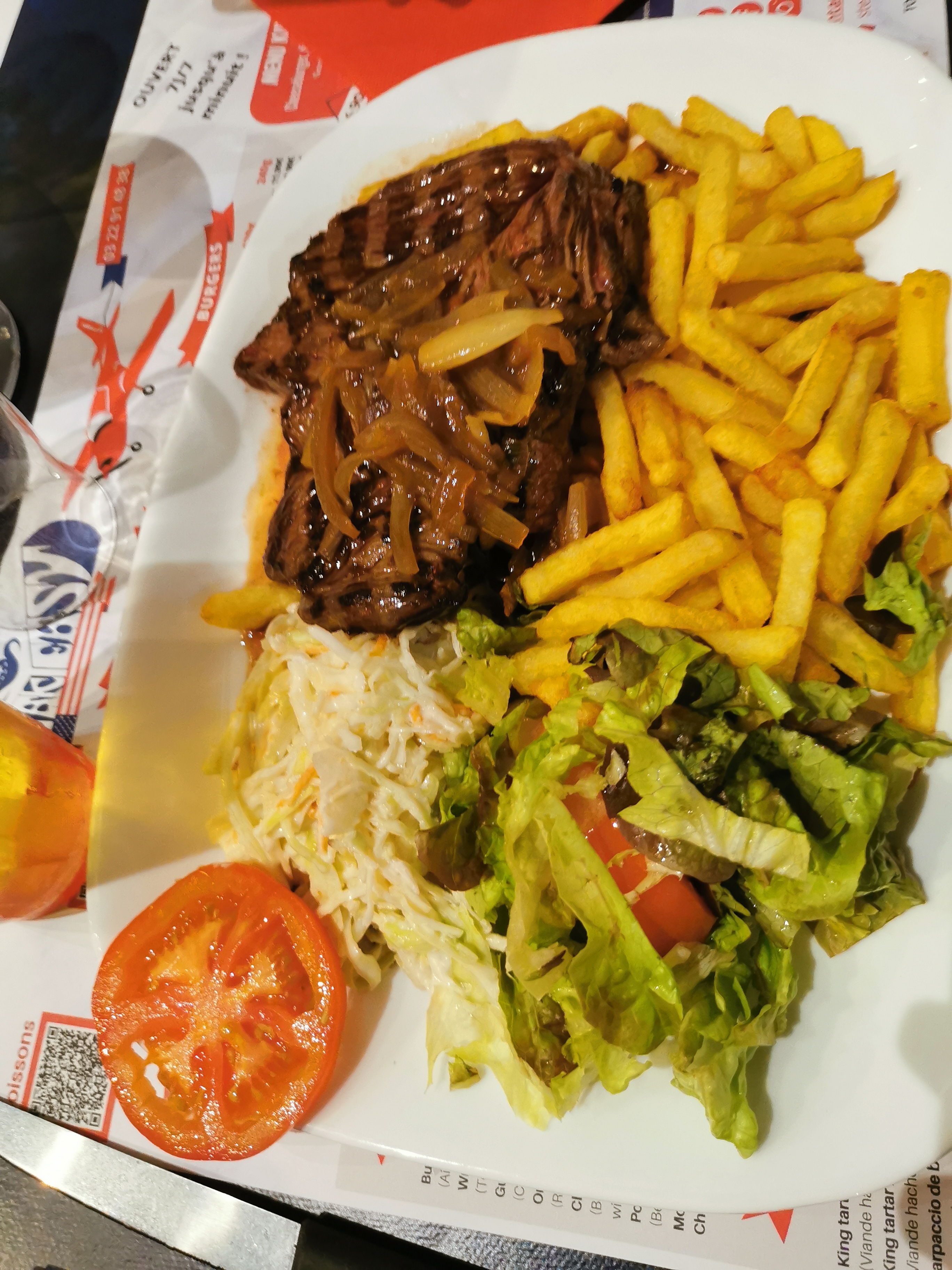 Ambiance sympa, mais nous restons un peu sur notre faim, frites surgelés, mixed grill moyen niveau qualité, ribs industriel, sauce industrielle de base (..), notre fils trouve un cheveux dans son hamburger, seule la brochette de bœuf semble être non industrielle, bref expérience moyenne