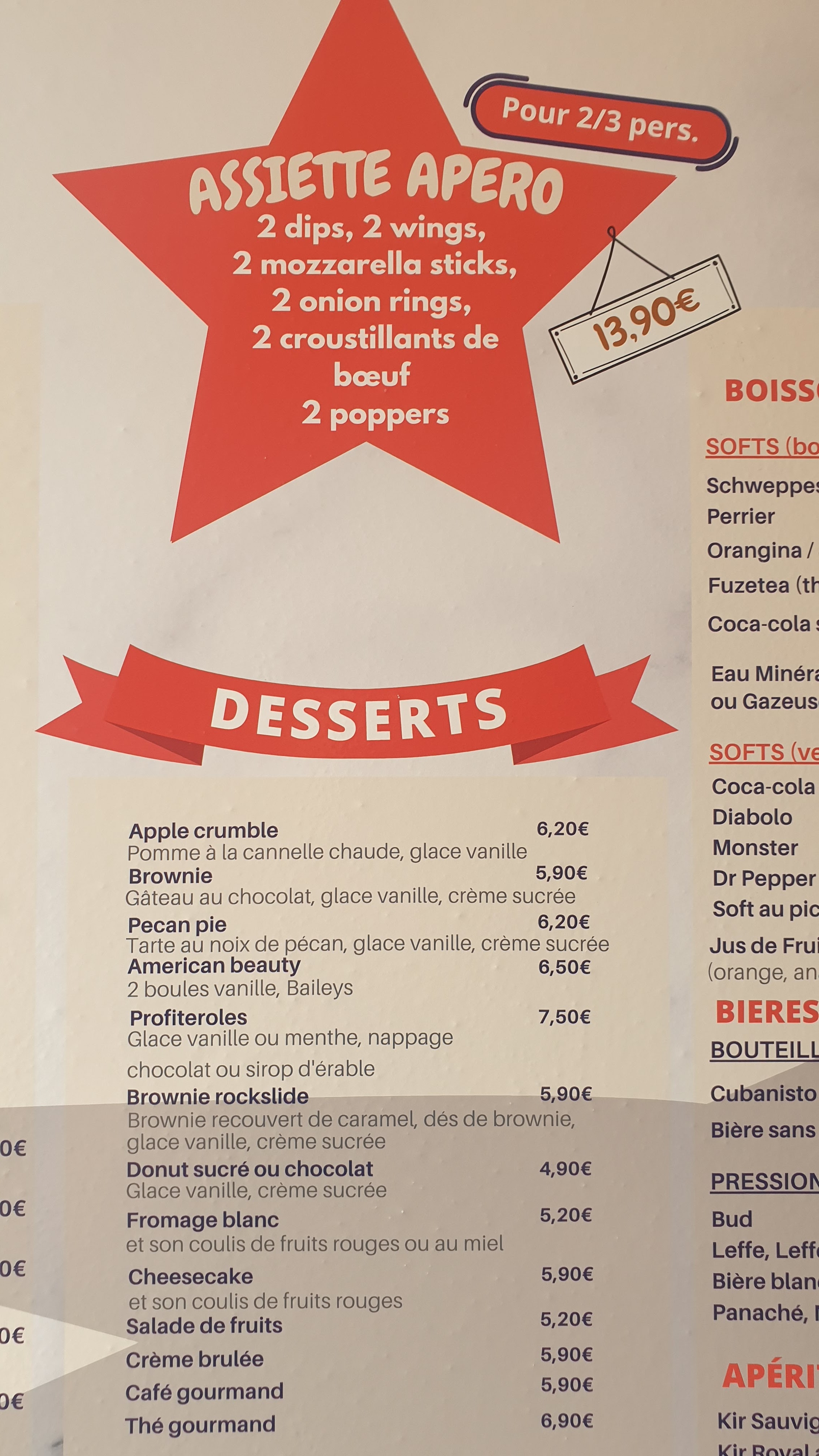 Nous avons hésité avant d'entrer mais n'avons finalement pas regretté la visite. Le menu est sympa avec de vrais spécialités américaines. L'assiette apéro est très bonne avec différentes pièces que l'on trempe dans la sauce cheddar ou barbecue. Pour les plats les propositions s'orientent essentiellement autour de la viande qui représente la spécialité maison. Nous avons opté pour mes burgers et c'était parfait, avec une bonne viande de bœuf. On ne triche pas sur les quantités et l'ensemble est très bon. Petite déception sur les frites qui ne sont pas exceptionnelles, une frite fraîche aurait été plus appropriée pour accompagner un si beau burger ! Pour le dessert, là c est le top, de bonnes glaces américaines à prix abordable et bien servies. C'est une excellente surprise qui permet de conclure sur une très bonne note. L'addition est fidèle à ce que nous avons commandé, pas de surprise même si j ai réclamé un petit peu de coleslaw avec ma salade 🥗. Enfin, il y a un très bon service plutôt rapide avec de la bonne humeur et du sourire. C'est toujours mieux pour passer un bon moment. Le cadre est sympa avec une belle décoration dans le thème américain et la pépite c'est le survol d'un petit avion au dessus de nos têtes. Il y a tout de même un point négatif, c'est extrêmement bruyant car c'est une grande salle, ce qui impose de parler fort et de partager la conversation avec le voisin.