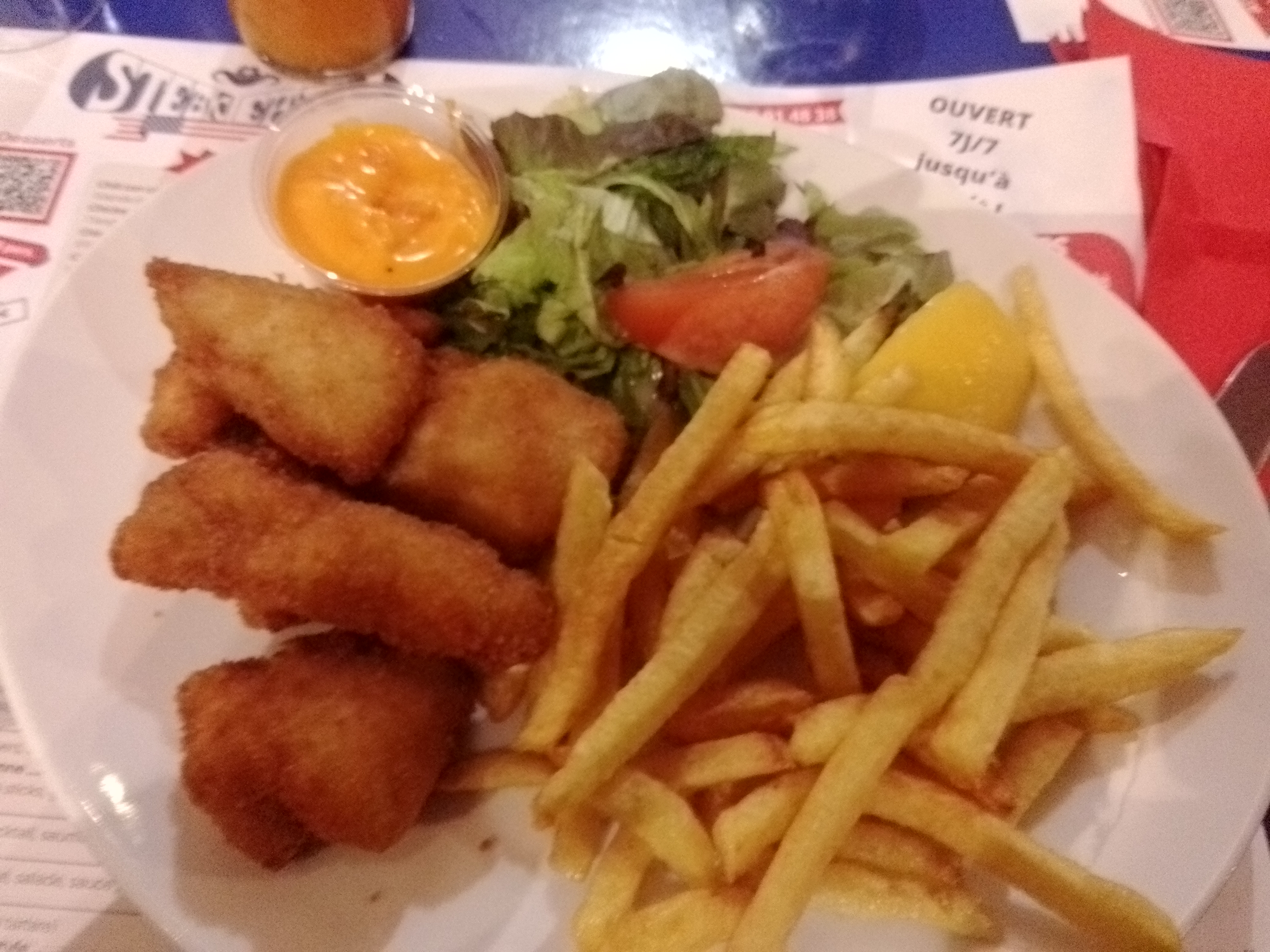 Repas : J'ai commandé des dips et j'ai attendu 45 min pour être servi. Les dips et les frites étaient dures comme de la pierre, j'ai été obligé de manger mon plat à la main sans mes couverts. Salle : Bon décor qui sort de l'ordinaire. L'avion accroché au plafond apporte une vraie plus-value. Par contre, mal agencée. Le patron qui rajoute des tables pliantes de camping au gré des arrivées clients.... Salle très bruyante, impossible de pouvoir converser avec les personnes qui sont pourtant à la même table. Amabilité : Pour le patron, au strict minimum... Bravo aux serveuses qui restent pros et courageuses malgré leurs conditions de travail qui ne doivent pas être aisées.
