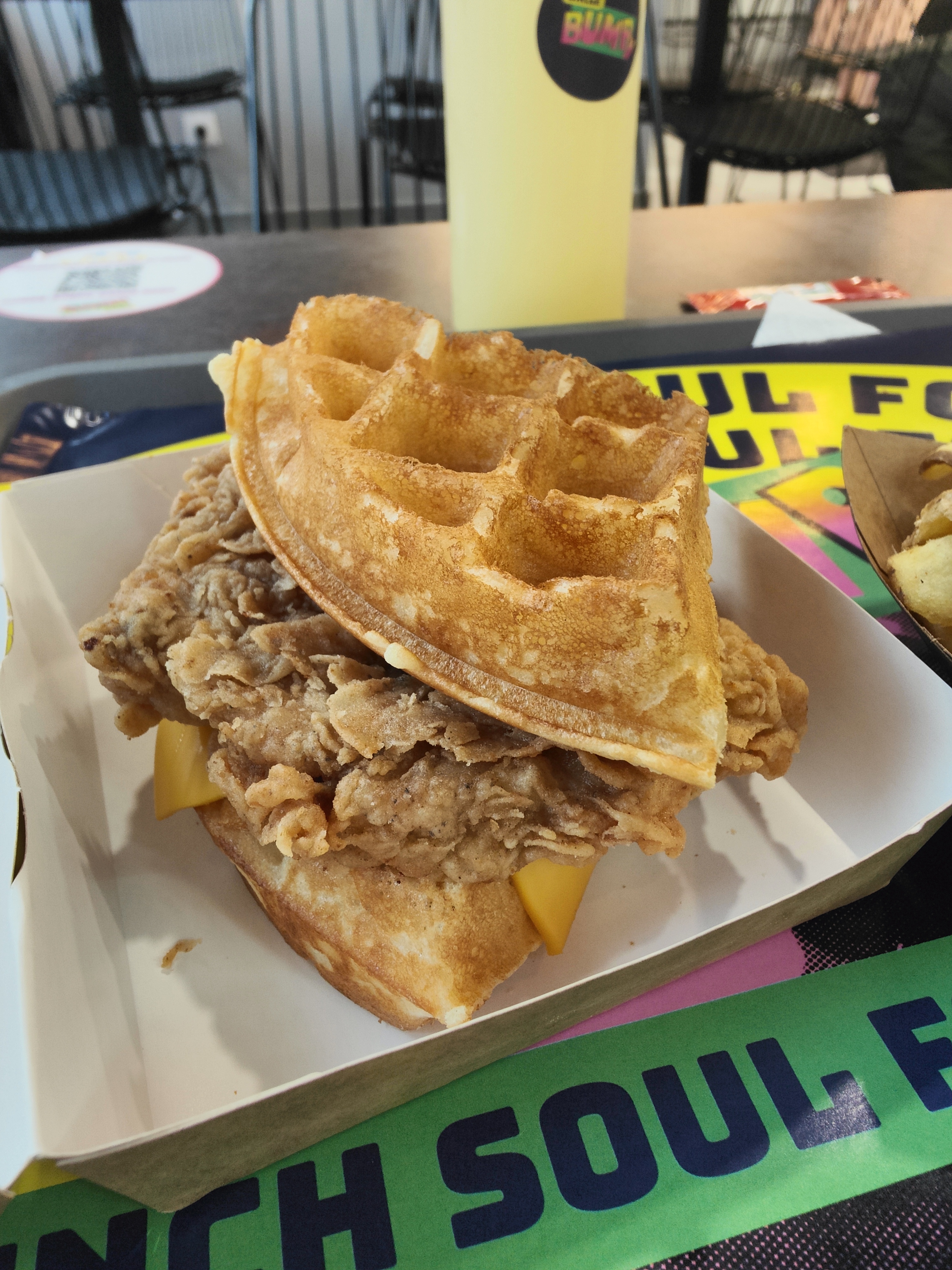 Une nouvelle adresse soul food, c'est un peu à la mode ces temps-ci Pour moins de 12€, j'ai eu un petit burger waffle au poulet, des patates et une citronnade maison Le waffle ne vous calera pas. C'était très bon, mais difficile de manger sans en mettre partout, la sauce sort carrément du waffle, peut-être proposer des gants comme font certaines adresses de poulet frits pourrait remédier à ça Franchement les pommes de terre étaient trop bonnes, une bonne recette maîtrisée. Dommage, pas de sauce maison La citronnade était bonne, bien dillulée et en bonne quantité À essayer, ils ont plusieurs adresses en IDF