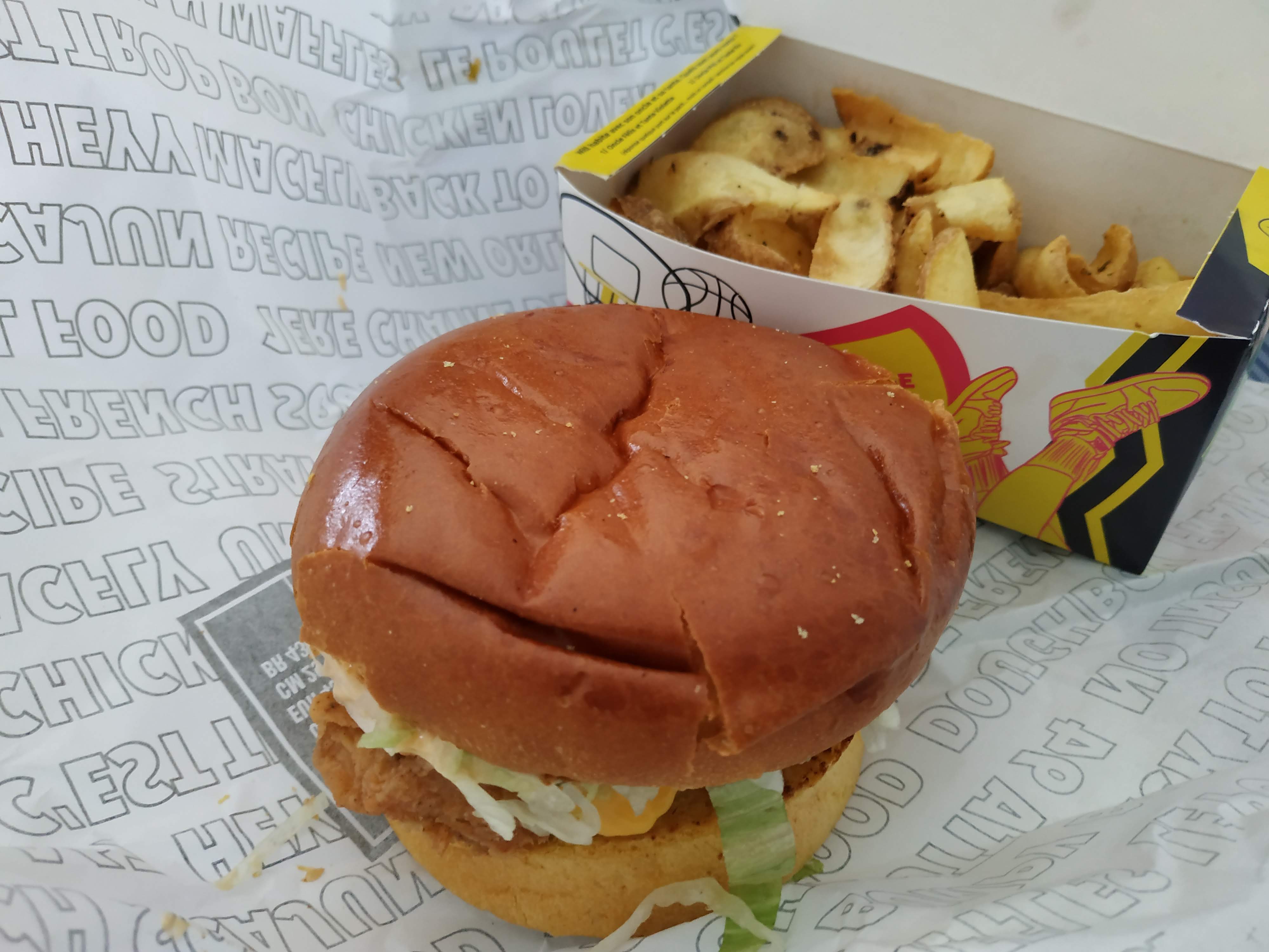 Délicieux. Le burger est généreux, la panure du poulet est bien croustillante. J ai pris celui qui a un sauce similaire au Big Mac et j' ai été conquise. Les frites sont correctes, celle a la patate douce originale. Les burgers sont préparés à la commande donc prévoir environ 10à 15 minutes d attente. C est la troisième fois que je m y rends et c est toujours aussi bon.