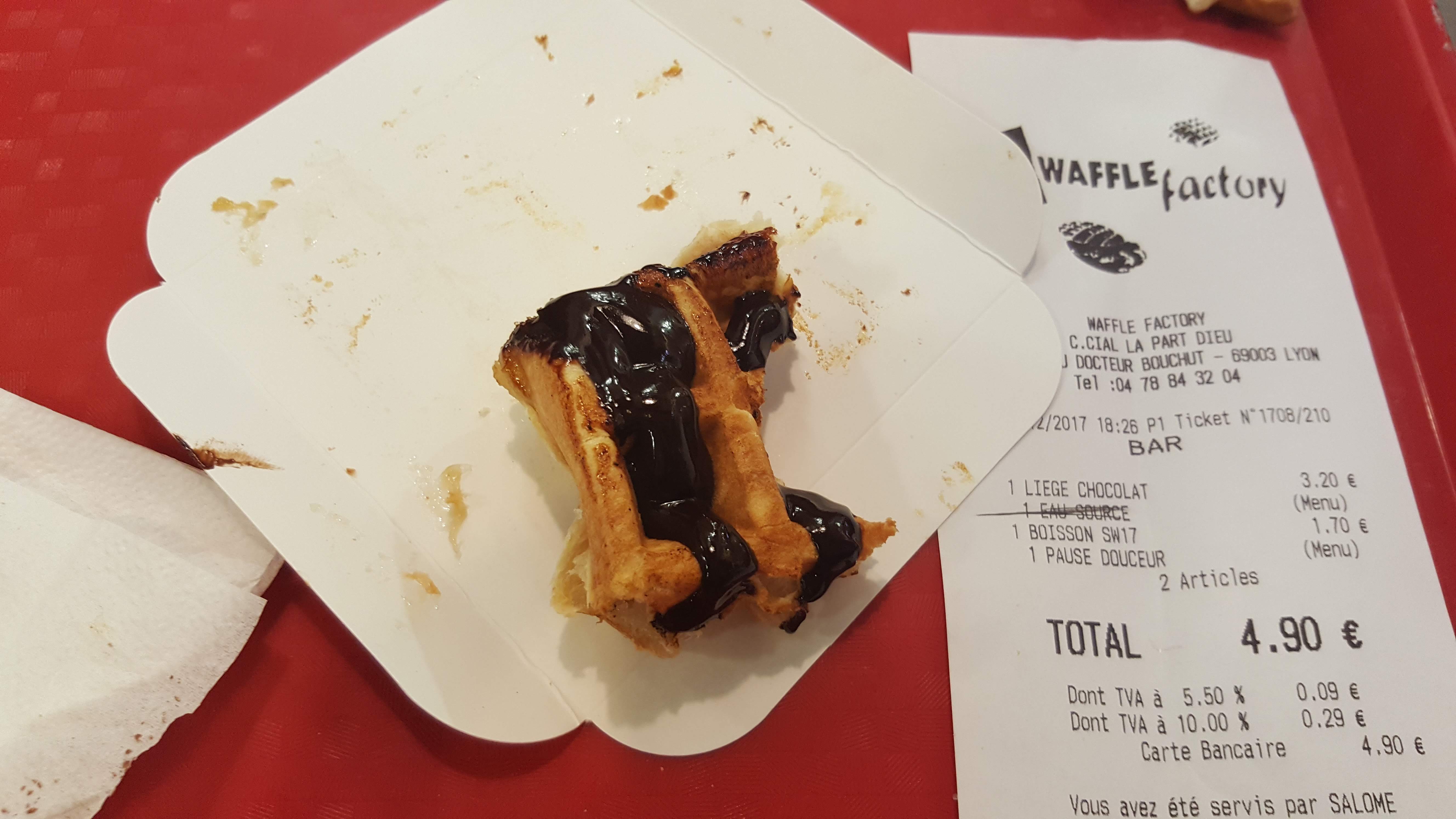 D'abord, on fait la queue : là, on voit les gaufres qui se préparent derrière le comptoir. La pâte semble avoir une consistance de pâte à pain, ça éveille la curiosité. Puis vient le temps de faire un choix et de se faire servir. La gaufre de liège au chocolat noir belge est simplement succulente. Légèrement caramélisée lors de la cuisson, elle fond en bouche. La pâte se détache presque comme une brioche. On regrettera toutefois que le nombre de places assises est trop faible. Selon l'heure de passage, ça peut être compliqué de s'y installer.