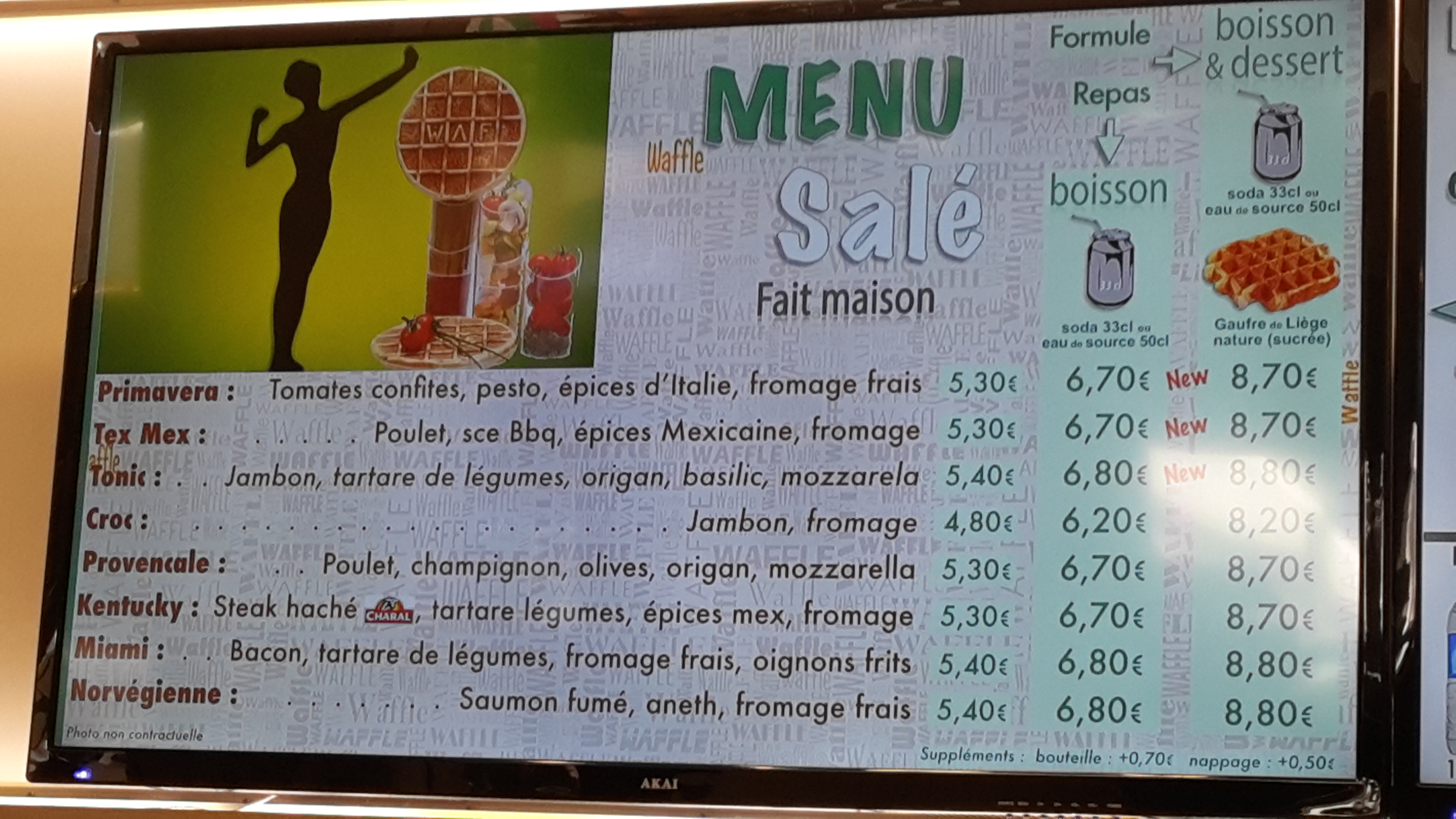 Des prix relativement correct et un concept original => sorte de sandwich mais en gauffre. A noter tout de même un manque évident de place pour manger sur place.